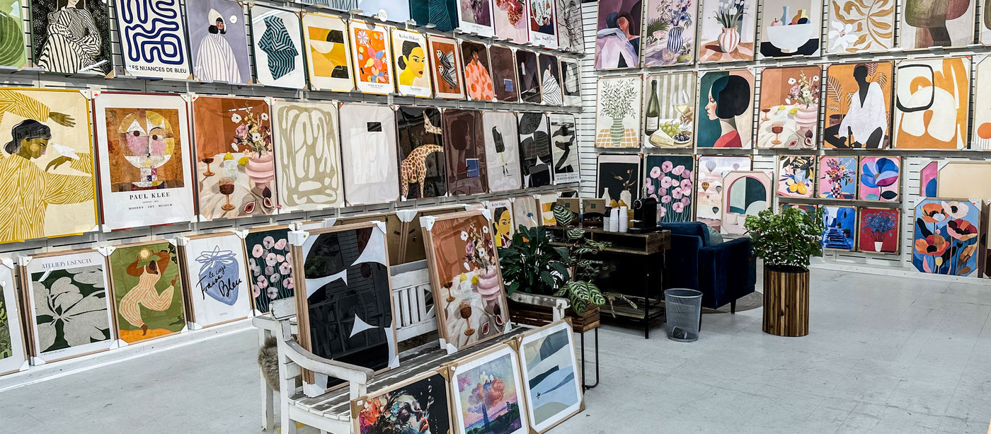 Bliv inspireret i vores 500 m2 store butik i Esbjerg, hvor kunst og indretning mødes. Udforsk alt fra plakater og malerier til spejle og opslagstavler – og oplev, hvordan du kan skabe personlige og levende vægge.