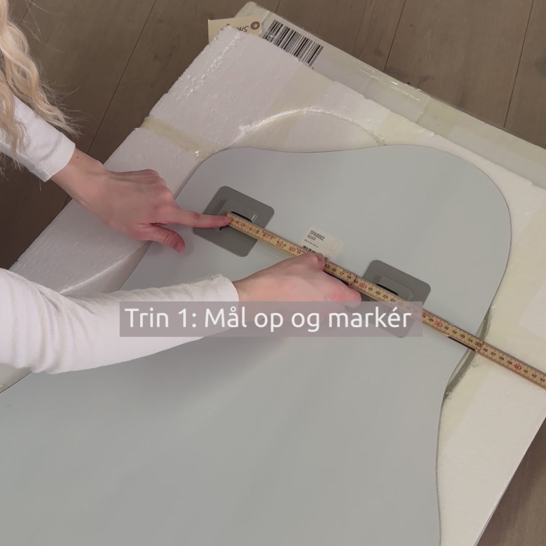 Når du har målene, markerer du på væggen hvor spejlet skal hænge. Start med at sætte de to prikker, og justér derefter til med dit vaterpas.