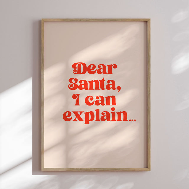 “Dear Santa, I Can Explain” af Prints by Ayleen bringer et smil frem hos alle. Den retroinspirerede typografi i klar rød farve står skarpt mod den rolige, lyse baggrund og skaber en humoristisk og stilren juleplakat. Teksten giver et lille glimt af frækhed og selvironi – perfekt til den, der måske ikke har været helt artig i år. En sjov og moderne juledekoration, som skaber god stemning i stuen, entréen eller på værelset.✓ Produceret i Danmark