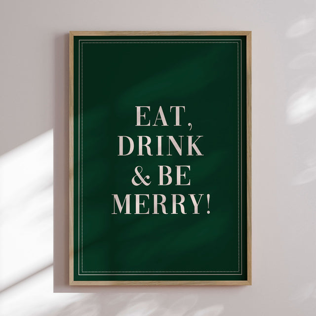 “Eat, Drink & Be Merry!” af Prints by Ayleen er en festlig og stilren hyldest til julens glæder. Den klassiske typografi i lys kontrast mod den dybe grønne baggrund giver plakaten et elegant udtryk, der passer perfekt ind i både moderne og traditionel julepynt. En enkel og livsglad plakat, der minder os om at nyde god mad, godt selskab og den hyggelige højtidsstemning.✓ Produceret i Danmark