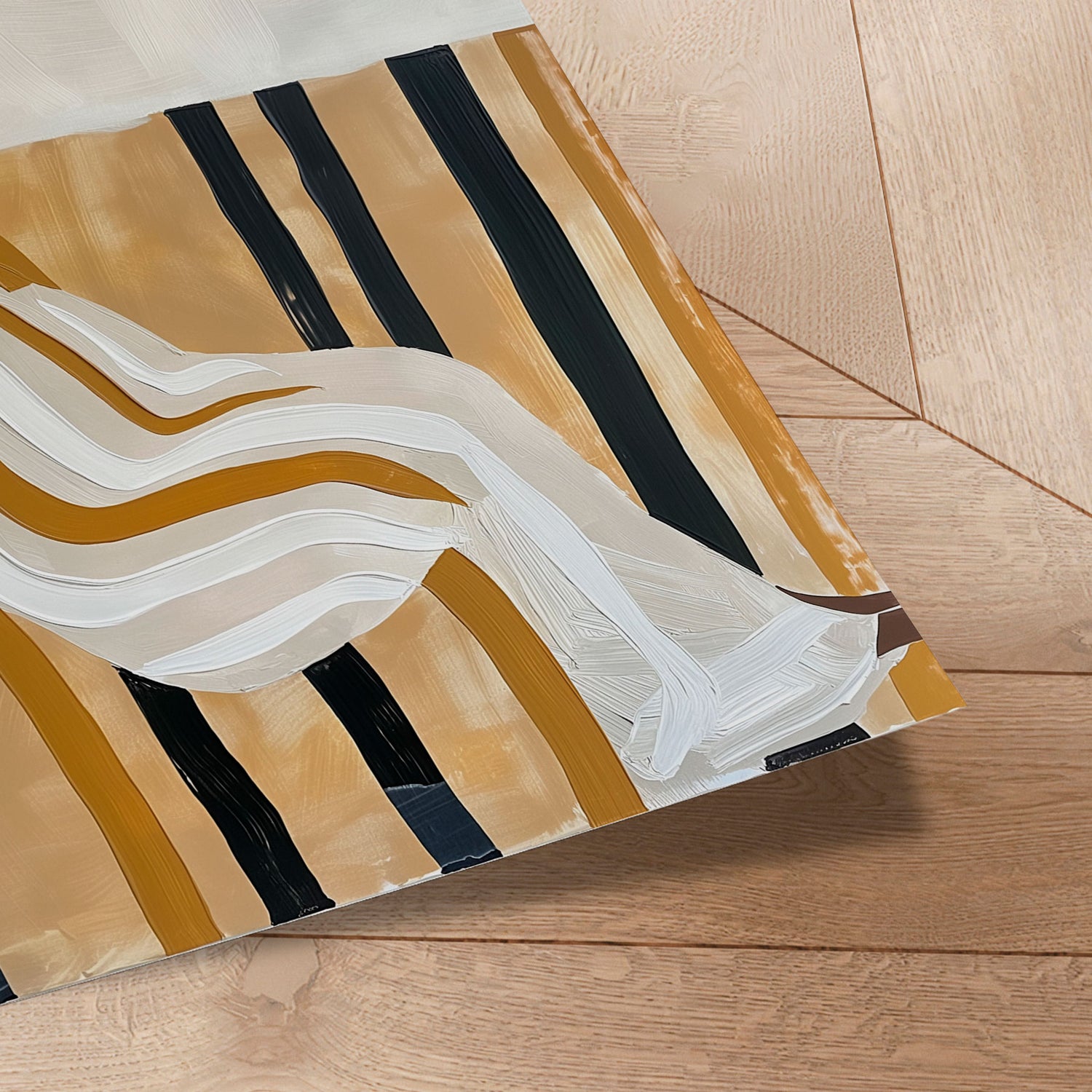 "Lady in Stripes" af SHANDU fanger et øjeblik af ro og stil. Den elegante silhuet er klædt i en draperet kjole med markante striber i gyldne, hvide og mørke nuancer, som skaber en harmonisk rytme i billedet. De grafiske linjer møder bløde penselstrøg i en komposition, der føles både moderne og tidløs. Plakaten tilfører et kunstnerisk statement til hjemmet og passer smukt ind i alt fra minimalistiske til varme, boheme-inspirerede rum.✓ Produceret i Danmark
