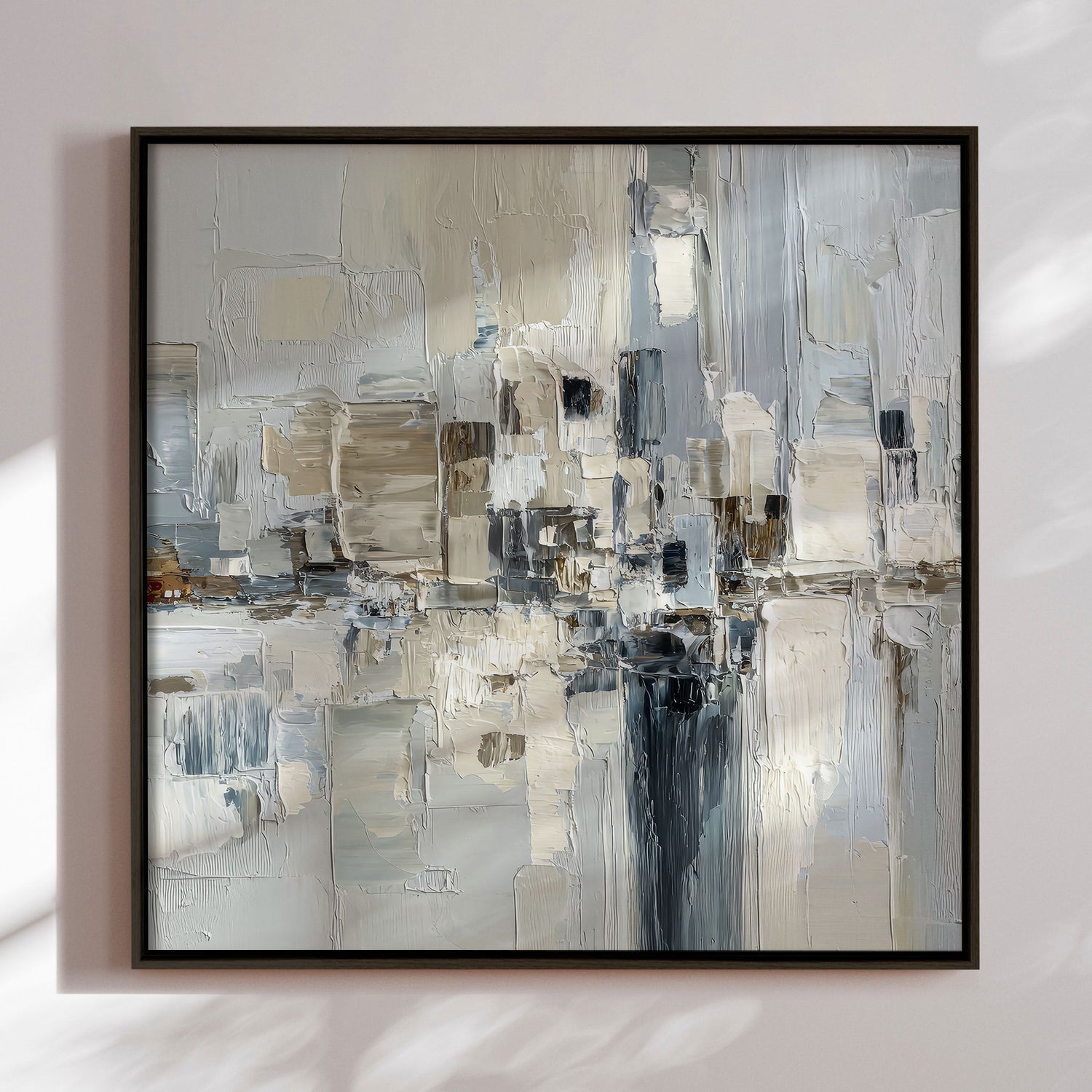“Pastel Construction” er et struktureret og moderne maleri, hvor bløde pasteller, varme beige toner og kølige grå nuancer mødes i et balanceret, arkitektonisk udtryk. De markante penselstrøg og lagdelte flader giver værket en rå elegance, hvor ro og energi eksisterer side om side. Et kunstværk, der tilfører rummet et sofistikeret, nutidigt præg med sans for både tekstur og dybde.