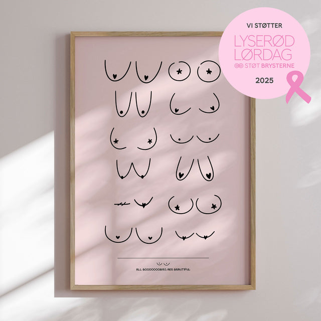 Skab et smil og en stærk erklæring med plakaten "Booooooobies II", designet specielt til Lyserød Lørdag og Støt Brysterne-kampagnen. Denne grafiske plakat illustrerer forskellige former og størrelser af bryster i et minimalistisk design, som hylder mangfoldighed og skønhed. Med en sart lyserød baggrund er plakaten både legende og tankevækkende, og den spreder budskabet om, at alle kroppe er smukke. Ved at vælge denne plakat bidrager du til en vigtig sag og bringer samtidig kunstnerisk skønhed ind i dit hjem.✓ Designet og produceret i Danmark