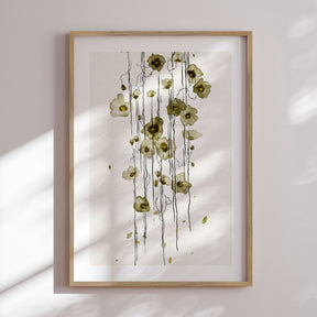 "Horizontal Greenery" af Ankie Kooi lader fine, akvarellagte blomster svæve ned ad papiret som sarte ranker, fanget med elegante, håndtegnede linjer. De olivengrønne og støvede nuancer skaber et roligt botanisk udtryk, hvor lette dryp og gennemsigtige lag giver motivet en følelse af bevægelse og poesi. Den generøse hvide plads omkring blomsterne forstærker det luftige indtryk og gør værket perfekt i lyse, skandinaviske rum. En raffineret naturaccent, der bringer blid ro til stue, soveværelse eller entré – smuk alene eller i en stille gallerivæg.✓ Produceret i Danmark