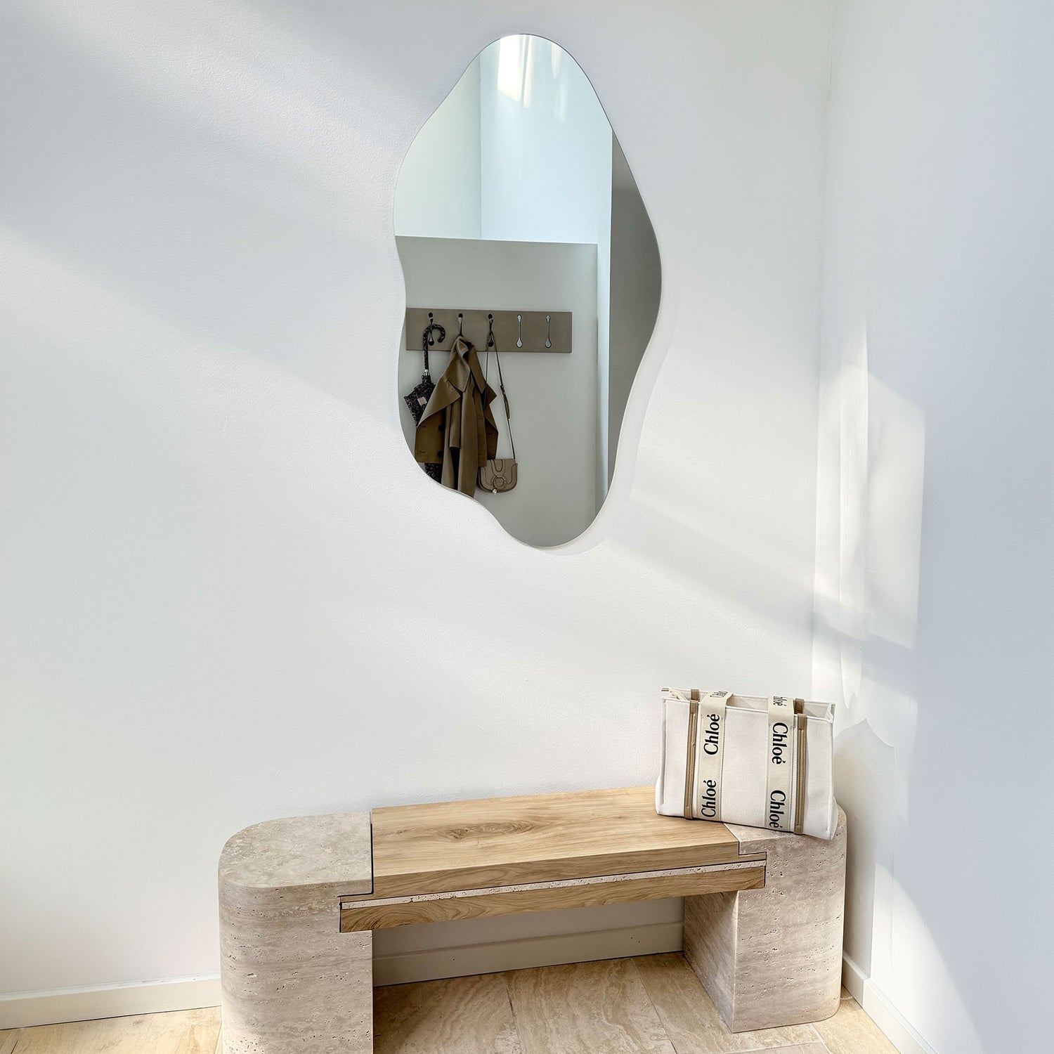 Dette organiske spejl præsenterer en minimalistisk æstetik, der kombinerer moderne elegance med et blødt, bølgende design. Spejlets polerede kant og naturlige, frie former giver det en lethed, der passer perfekt ind i både moderne og skandinaviske interiører. Med sin elegante silhuet tilfører spejlet et kunstnerisk præg til ethvert rum, hvad enten det placeres i entreen, soveværelset eller stuen. Det svævende design skaber et let og luftigt udtryk, der smukt reflekterer lyset og giver rummet en følelse af rummelighed.✓ Dansk design