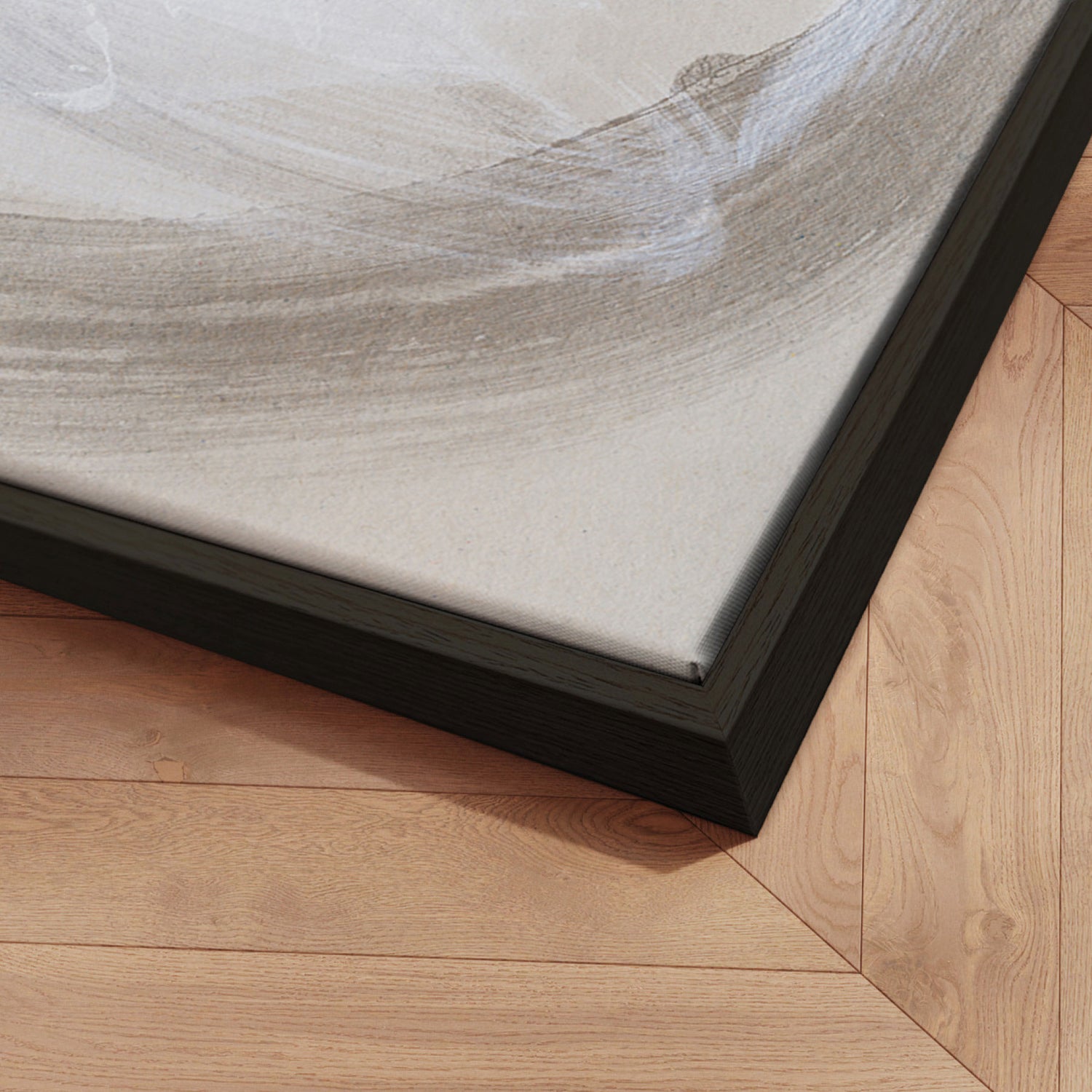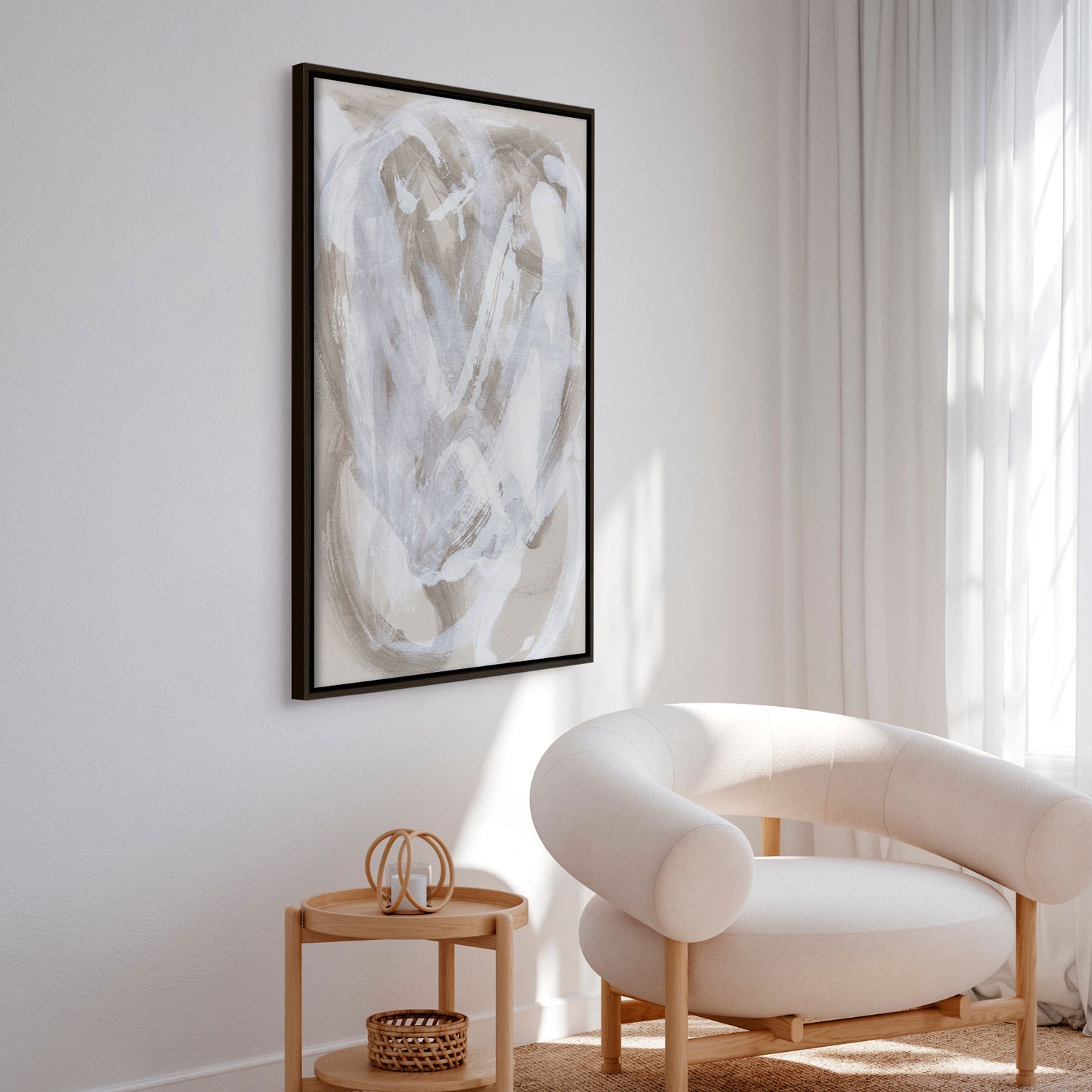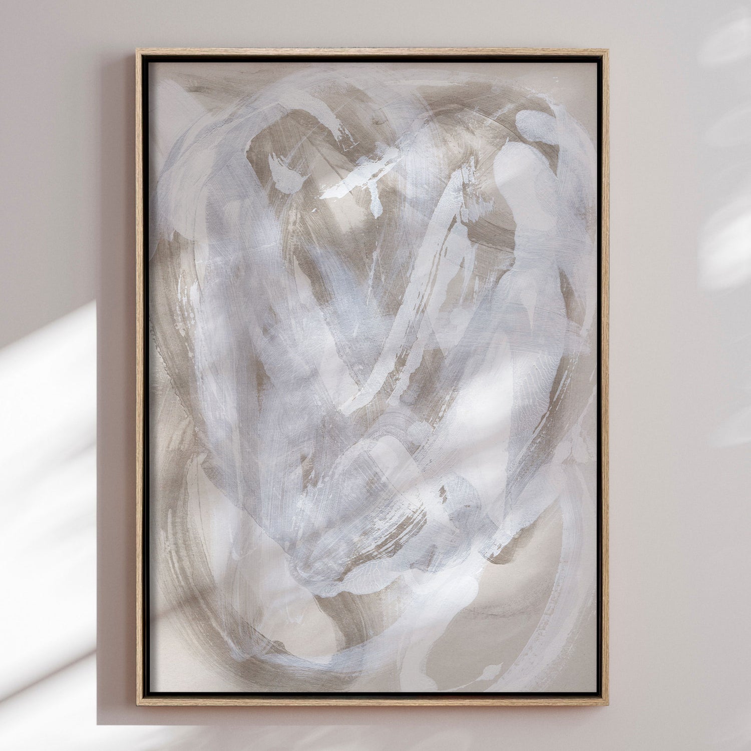 "Abstract Brush Strokes 146" af Mareike Böhmer er et maleri, hvor bløde penselstrøg og lag smelter sammen i en rolig, sanset bevægelse. De lyse nuancer af beige, grå og hvid overlapper hinanden og skaber et næsten tåget udtryk, som giver værket dybde uden tyngde. De organiske former og spor af håndens bevægelse tilfører en stille energi, der inviterer til fordybelse. Et elegant og tidløst kunstværk, der tilfører rummet ro, balance og et subtilt kunstnerisk nærvær.✓ Designet og produceret i Danmark