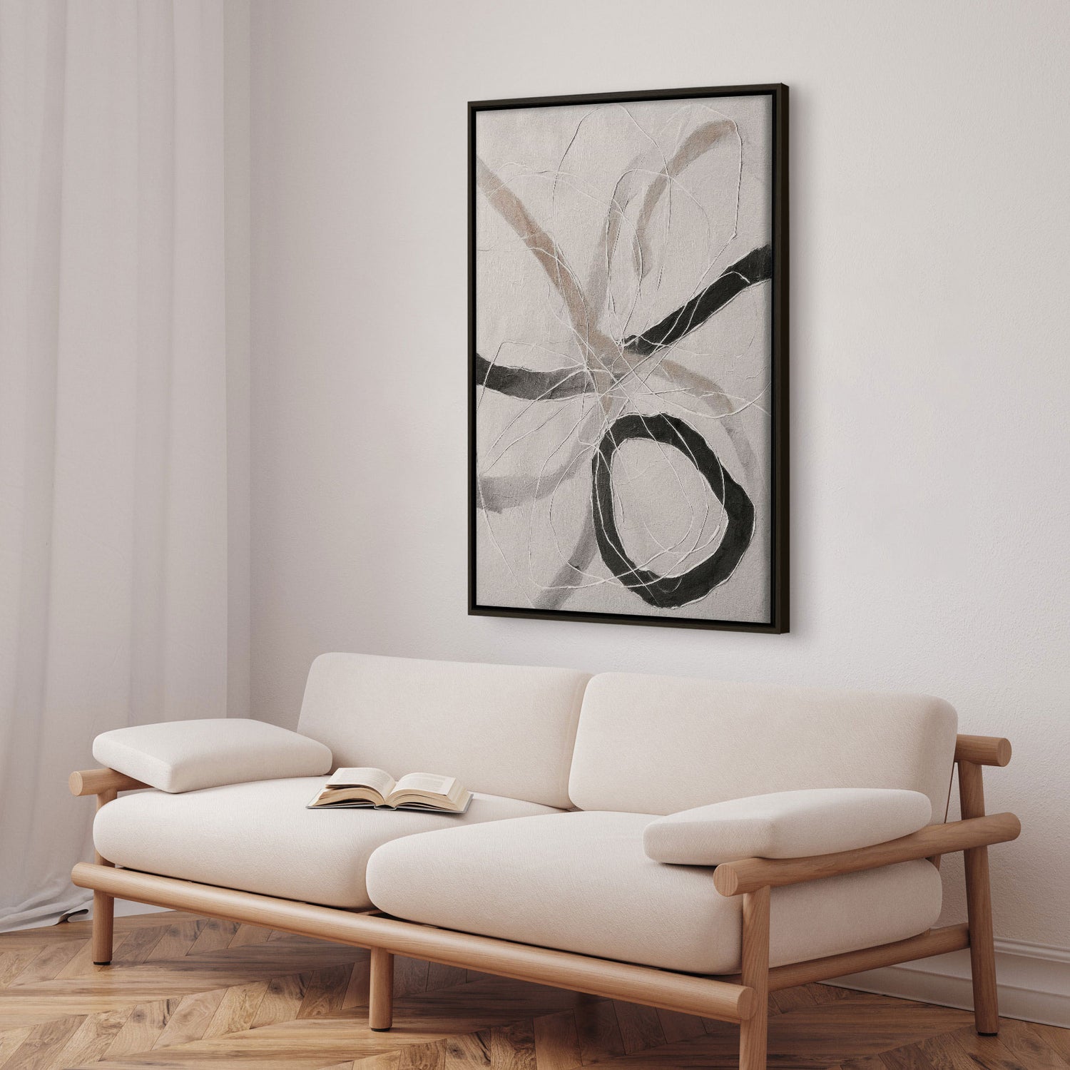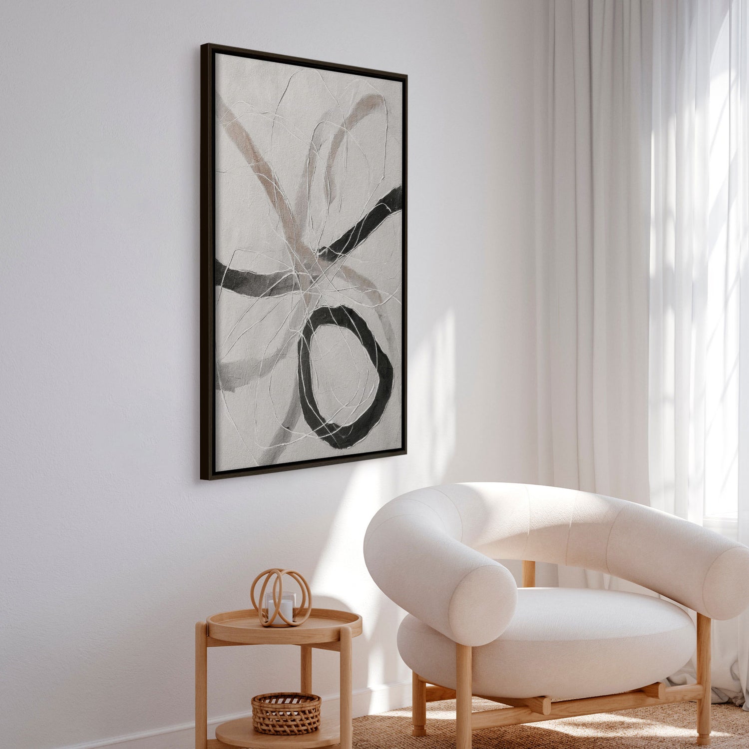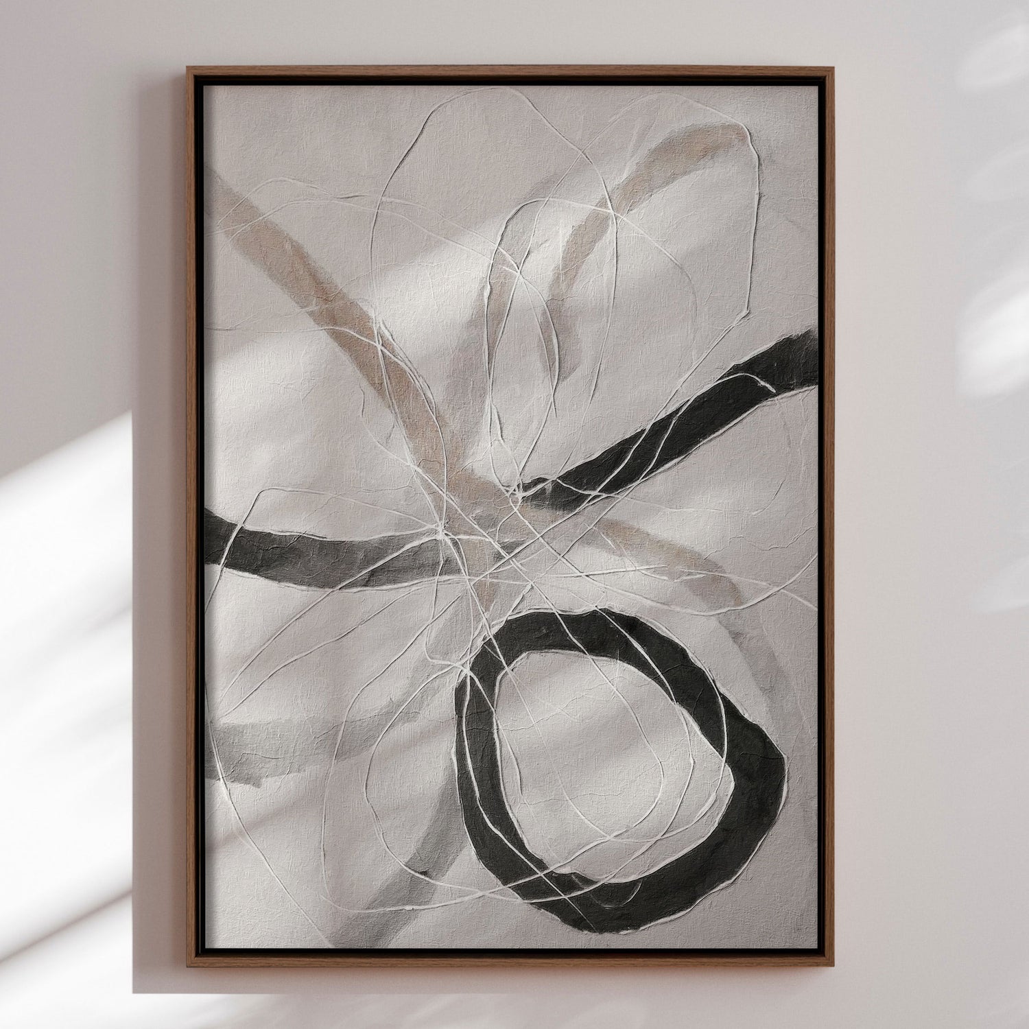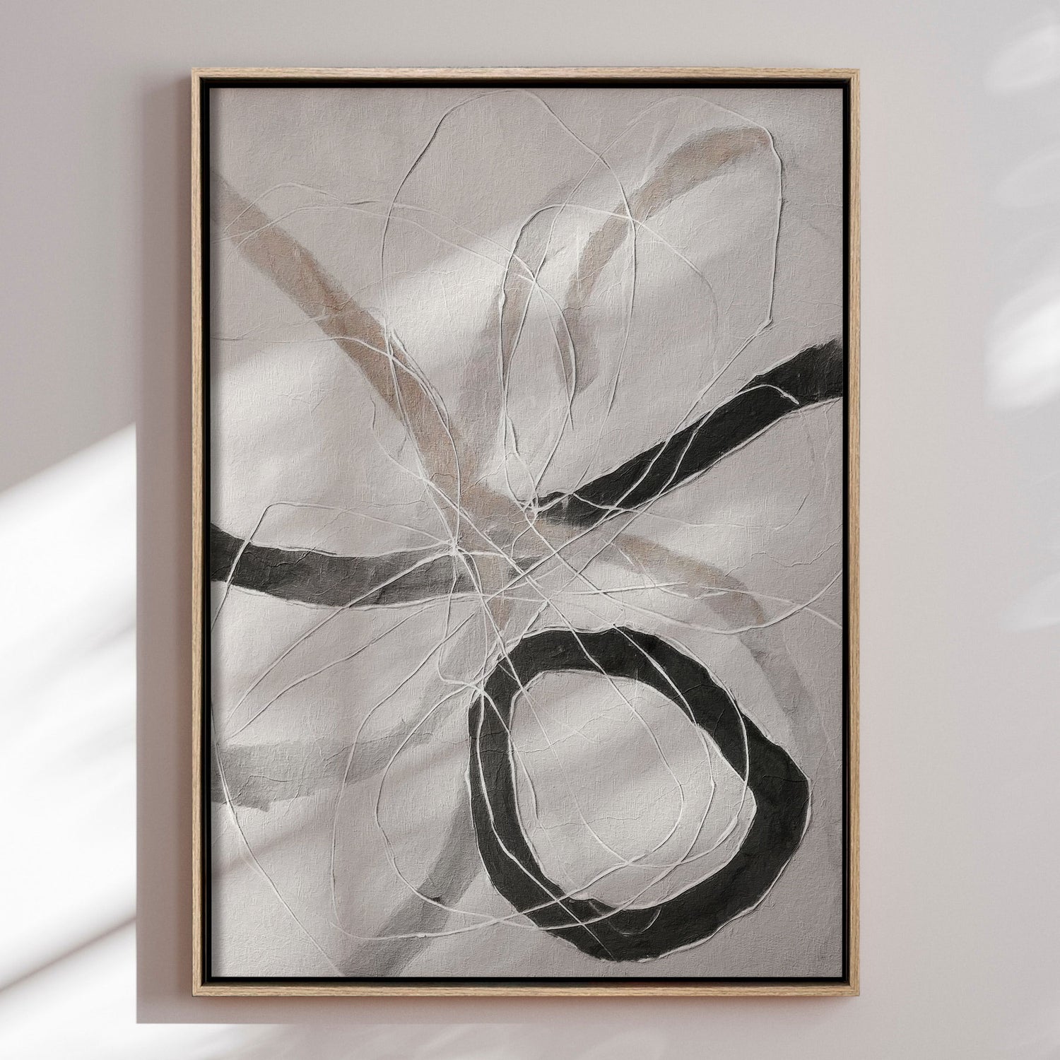 "Line Study" er et roligt og raffineret maleri, hvor bløde beige og grå nuancer balanceres af dybe sorte former og fine, lyse linjer. De organiske bevægelser krydser hinanden i en let og næsten poetisk komposition, der giver værket en følelse af både struktur og frihed. Overfladen og de afdæmpede kontraster skaber dybde uden at virke tunge, hvilket gør maleriet harmonisk og tidløst. Et elegant kunstværk, der tilfører rummet ro, eftertænksomhed og et subtilt kunstnerisk udtryk.✓ Designet og produceret i Danmark