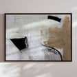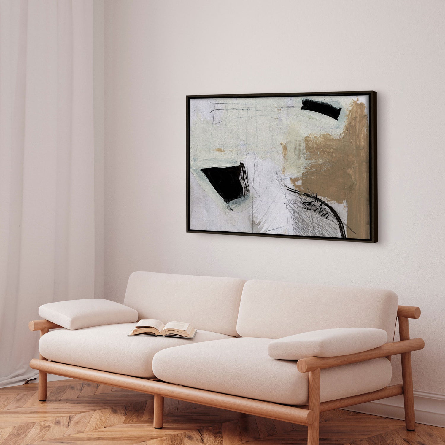 “Motion” af Dan Hobday er et studie i balance mellem det rå og det rolige. Sorte, markante former bryder den lyse, teksturerede baggrund, mens jordfarvede flader og fine stregdetaljer tilfører værket en spontan energi. Kompositionen føles både åben og fokuseret – et moderne maleri, der skaber bevægelse og karakter i rummet uden at overdøve indretningen.