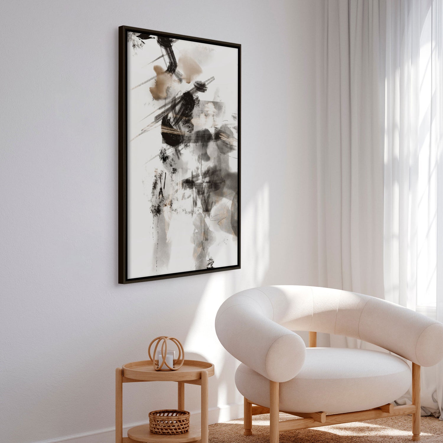 "Whispers of Ink" af 1x Studio II er et maleri, hvor spontane penselstrøg og lag smelter sammen i en rå, men afbalanceret komposition. Sorte og grå nuancer bevæger sig frit over lærredet, brudt af varme jordtoner, der tilfører dybde og emotionel tyngde. Værket føles næsten som et fragment af en bevægelse – flygtigt, men intenst – og inviterer beskueren til at gå på opdagelse i de mange teksturer og spor. Et markant og stemningsfuldt kunstværk, der tilfører karakter og kunstnerisk nerve til moderne rum.✓ Designet og produceret i Danmark