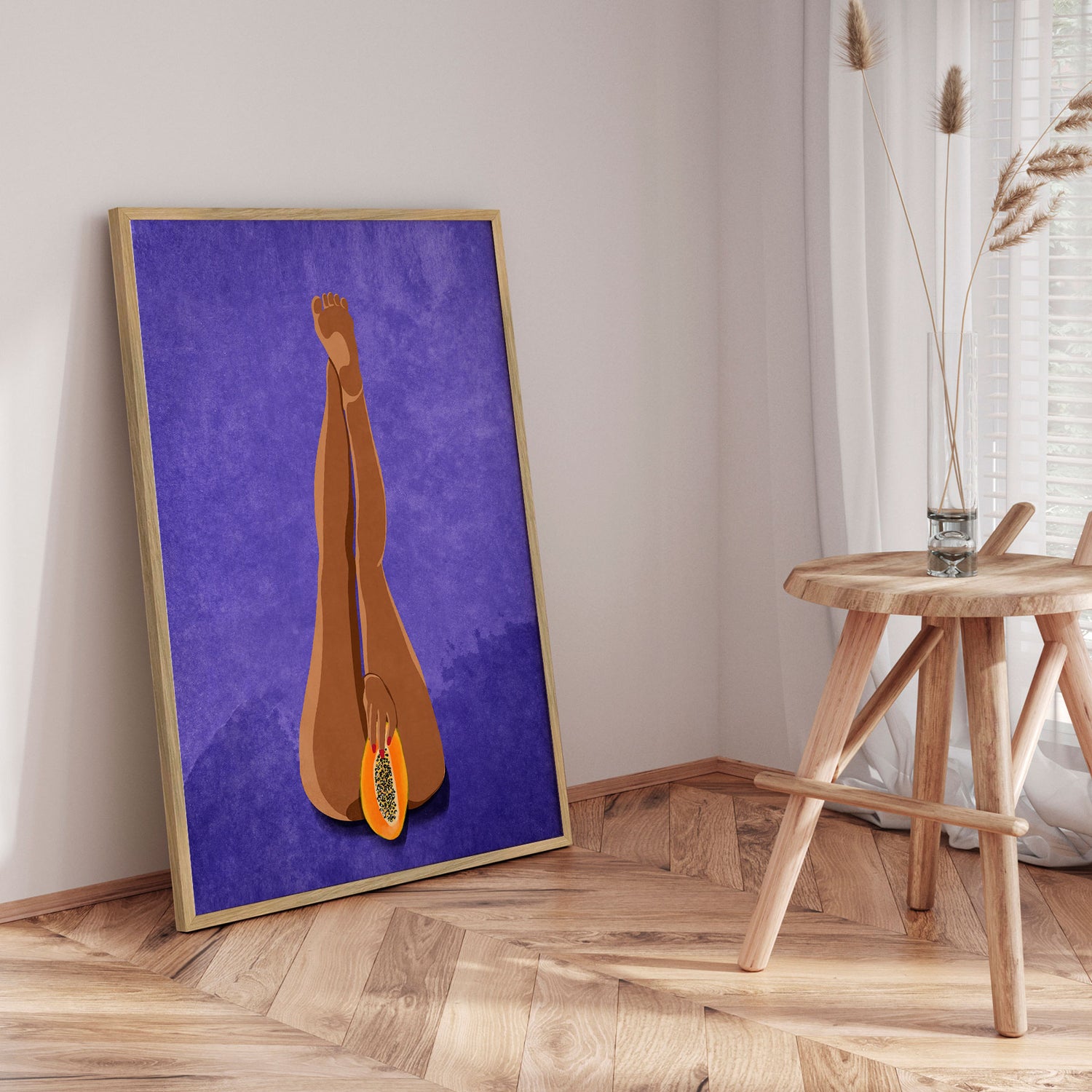 "My Papaya" af Raissa Oltmanns er et stærkt og kropsbevidst kunstværk, der leger med femininitet, begær og selvbestemmelse. Den stiliserede kvindekrop og den åbne papaya skaber et tydeligt, symbolsk billede fyldt med styrke og selvsikkerhed. Den dybe blå-lilla baggrund forstærker motivets intensitet. En plakat, der udfordrer blikket, fejrer kroppen og tilfører rummet mod og attitude.