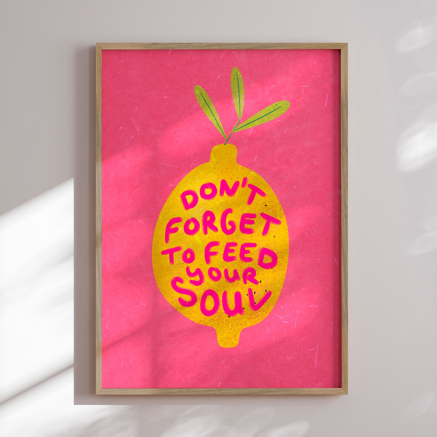 "Souldfood Lemon" af Raissa Oltmanns er en farverig og opløftende plakat med et klart budskab: husk at give næring til din sjæl. Den gule citron med teksten “Don’t forget to feed your soul” står stærkt mod den rosa baggrund og skaber et optimistisk, energifyldt udtryk. En plakat, der minder dig om selvomsorg, glæde og balance – hver eneste dag.