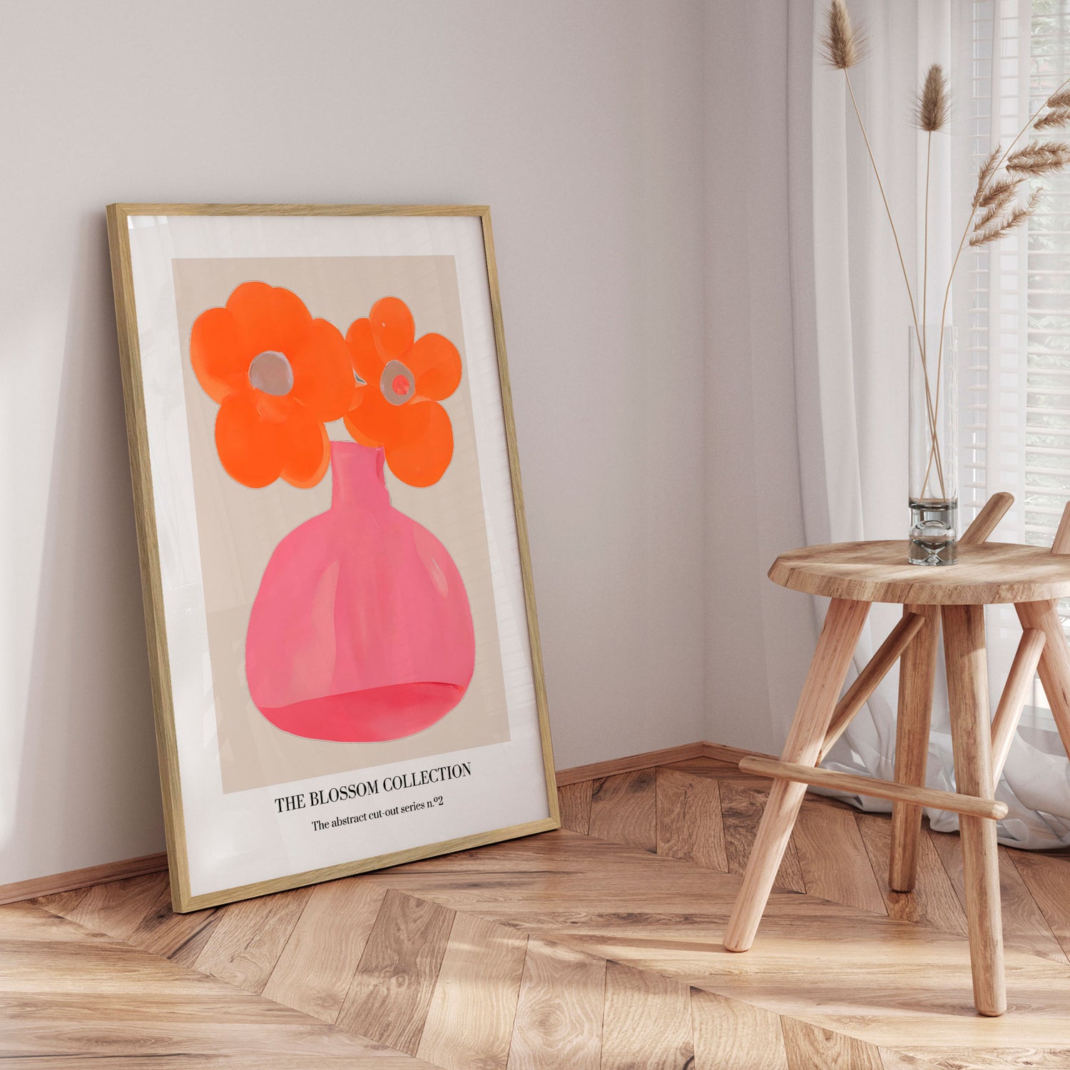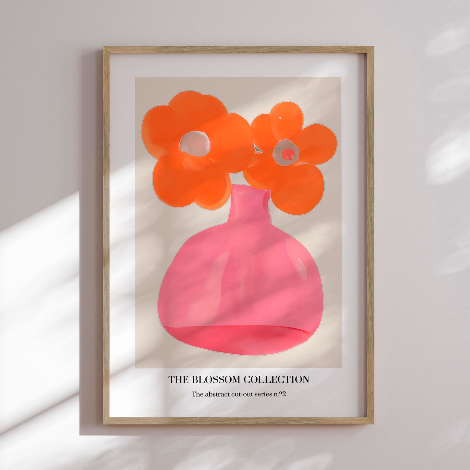 "The Blossom Collection Nr. 2" af Merel Takken er en abstrakt fortolkning af blomster i en vase, skabt i bløde, organiske former og varme nuancer af pink og orange. De enkle udskæringer og transparente lag giver motivet et let, moderne udtryk. En plakat, der balancerer det legende og det stilrene og tilfører rummet farve og ro.