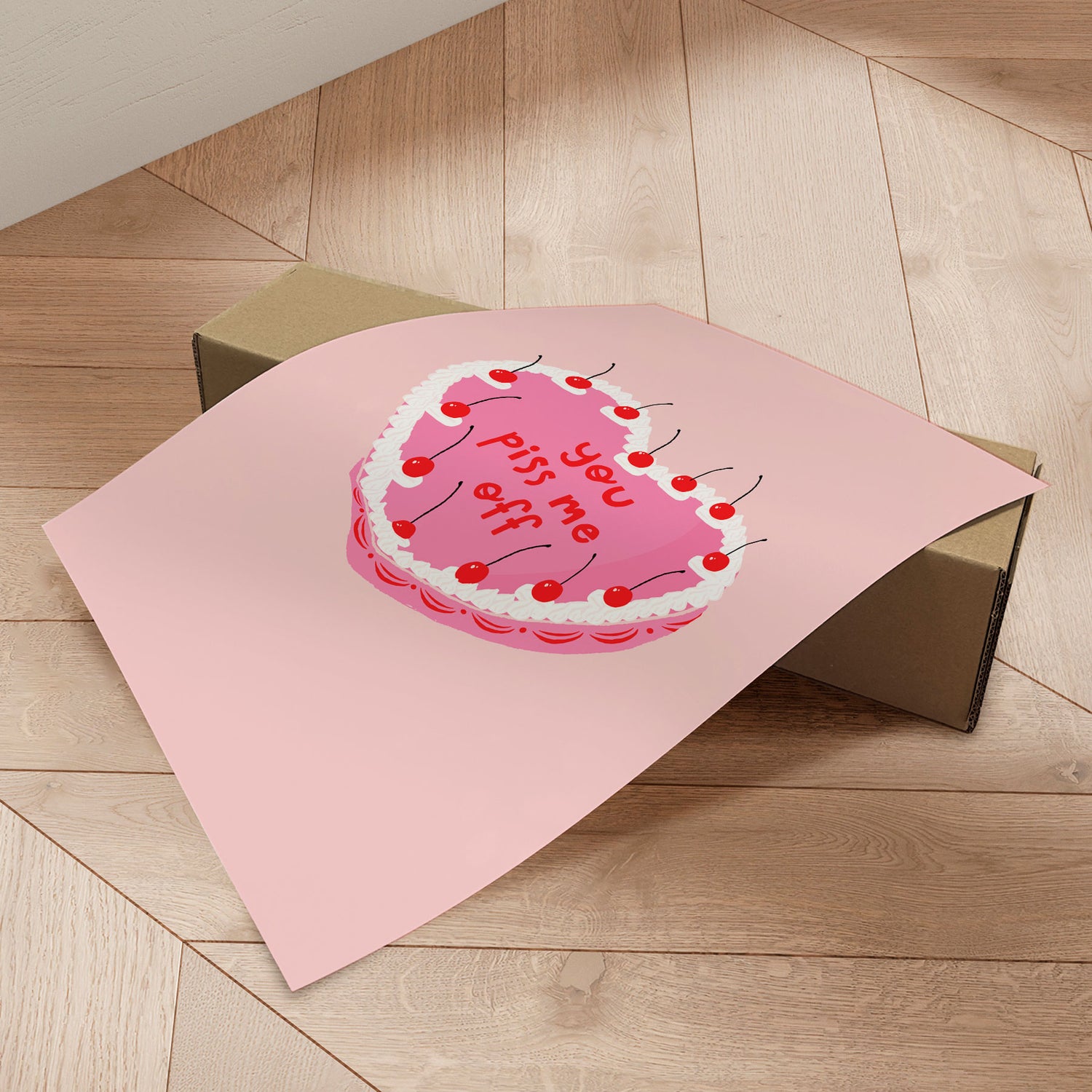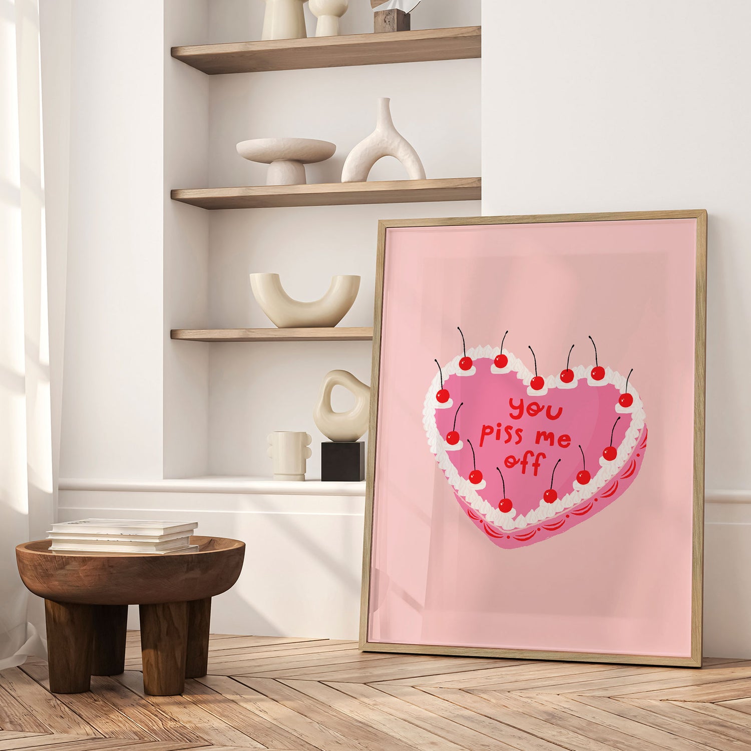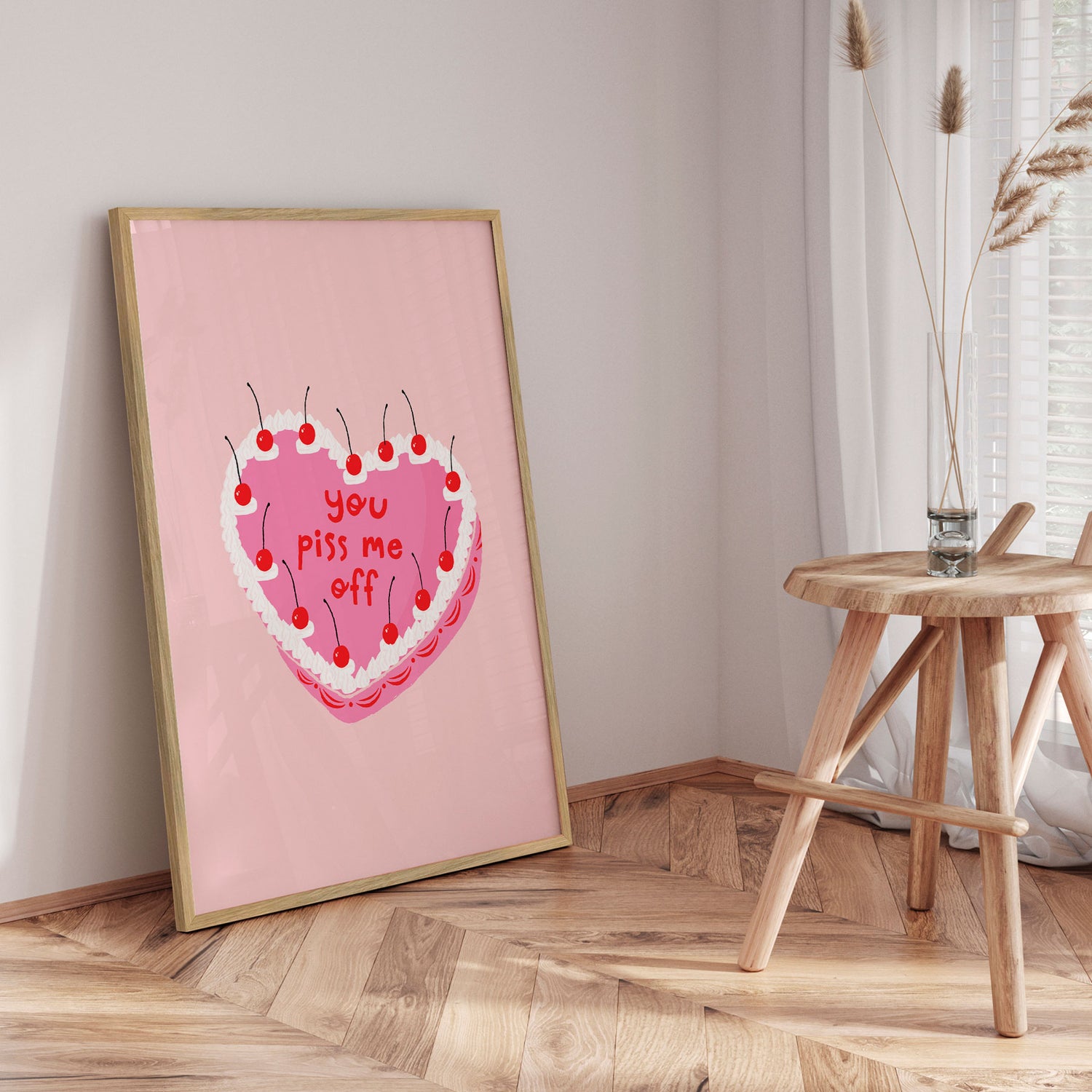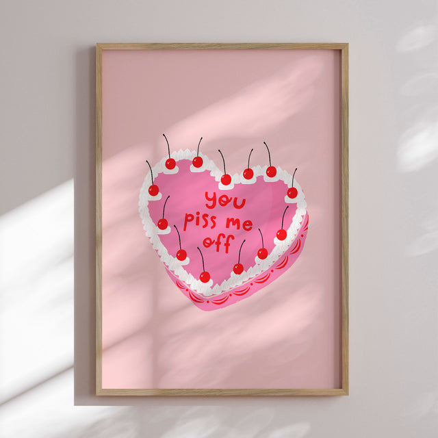 “You Piss Me Off” af Duchess Plum er en humoristisk og lettere provokerende plakat, der leger med kontrasten mellem det sukkersøde og det ærligt direkte. Det lyserøde, hjerteformede kagemotiv med flødeskum og kirsebær giver associationer til klassiske kærlighedsbudskaber – men teksten vender forventningen på hovedet. Resultatet er et udtryksfuldt statement med glimt i øjet, der både kan få smilet frem og skabe kant i indretningen. En perfekt plakat til dig, der elsker humor, selvironi og ikke tager tingene alt for højtideligt.✓ Produceret i Danmark