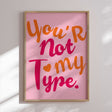 “You’re Not My Type” af Gauri Mokate er en farverig og humoristisk statement-plakat, der siger det højt, som mange tænker. Med håndtegnet typografi i varme pink- og orange nuancer og et legende hjerte midt i teksten, balancerer motivet perfekt mellem kærlighed og kant. Den lyserøde baggrund giver et blødt udtryk, mens budskabet står skarpt og selvsikkert. En plakat med glimt i øjet, der hylder personlighed, grænser og retten til at vælge selv – uden at undskylde.✓ Produceret i Danmark