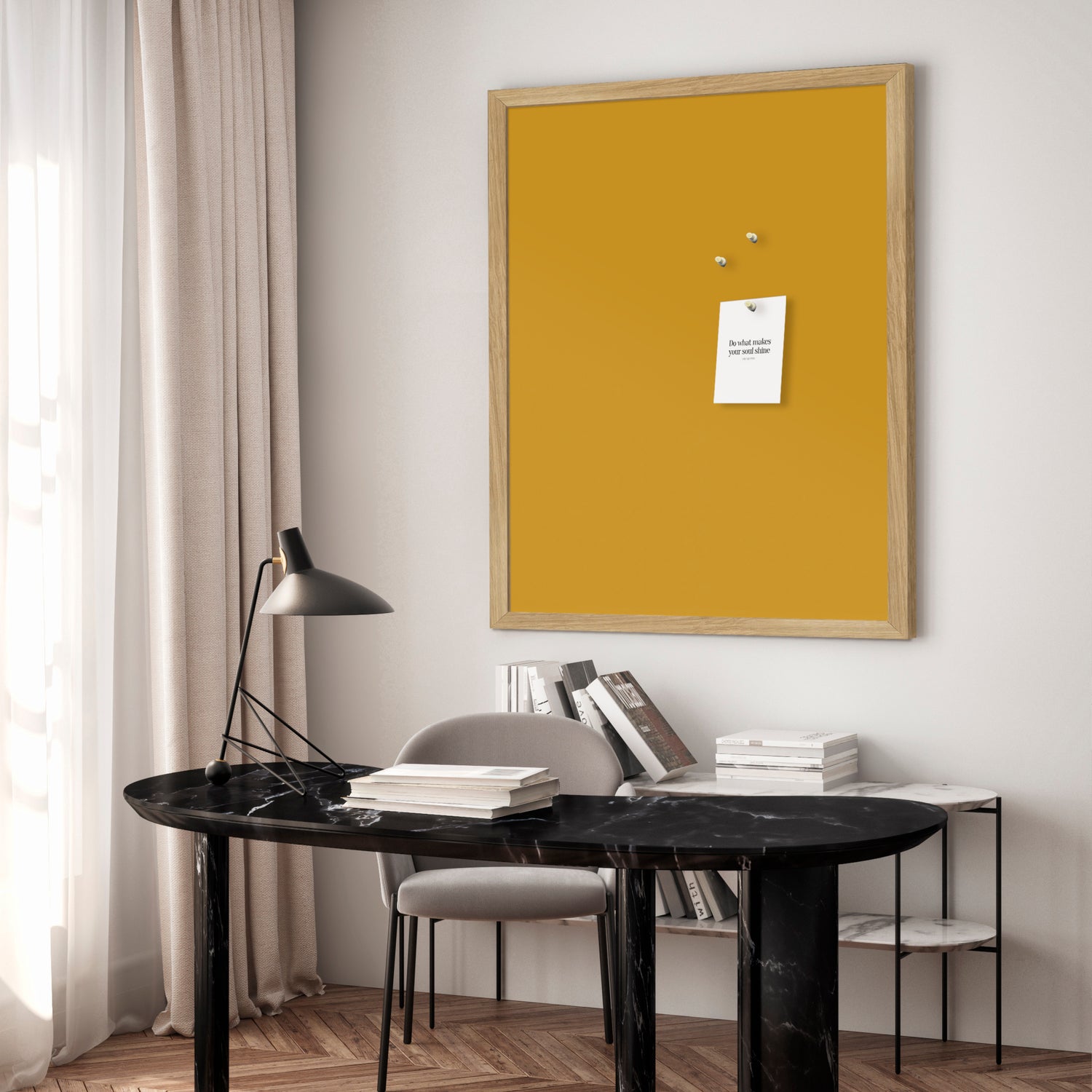 "Lemon Curry" opslagstavlen kombinerer klassisk elegance med praktisk funktionalitet. Denne tidløse tavle er udført i høj kvalitet og har en brændt gul farve, der passer perfekt til varme indretning. Skab organisering og inspiration i dit hjem eller kontor ved at bruge denne opslagstavle til at vise billeder, påmindelser og noter. Lad "Lemon Curry" opslagstavlen hjælpe dig med at holde styr på dine ideer og projekter samtidig med at den tilfører et strejf af stil til dine vægge.✓ Opslagstavle til fastgørelse af personlige notater og beskeder