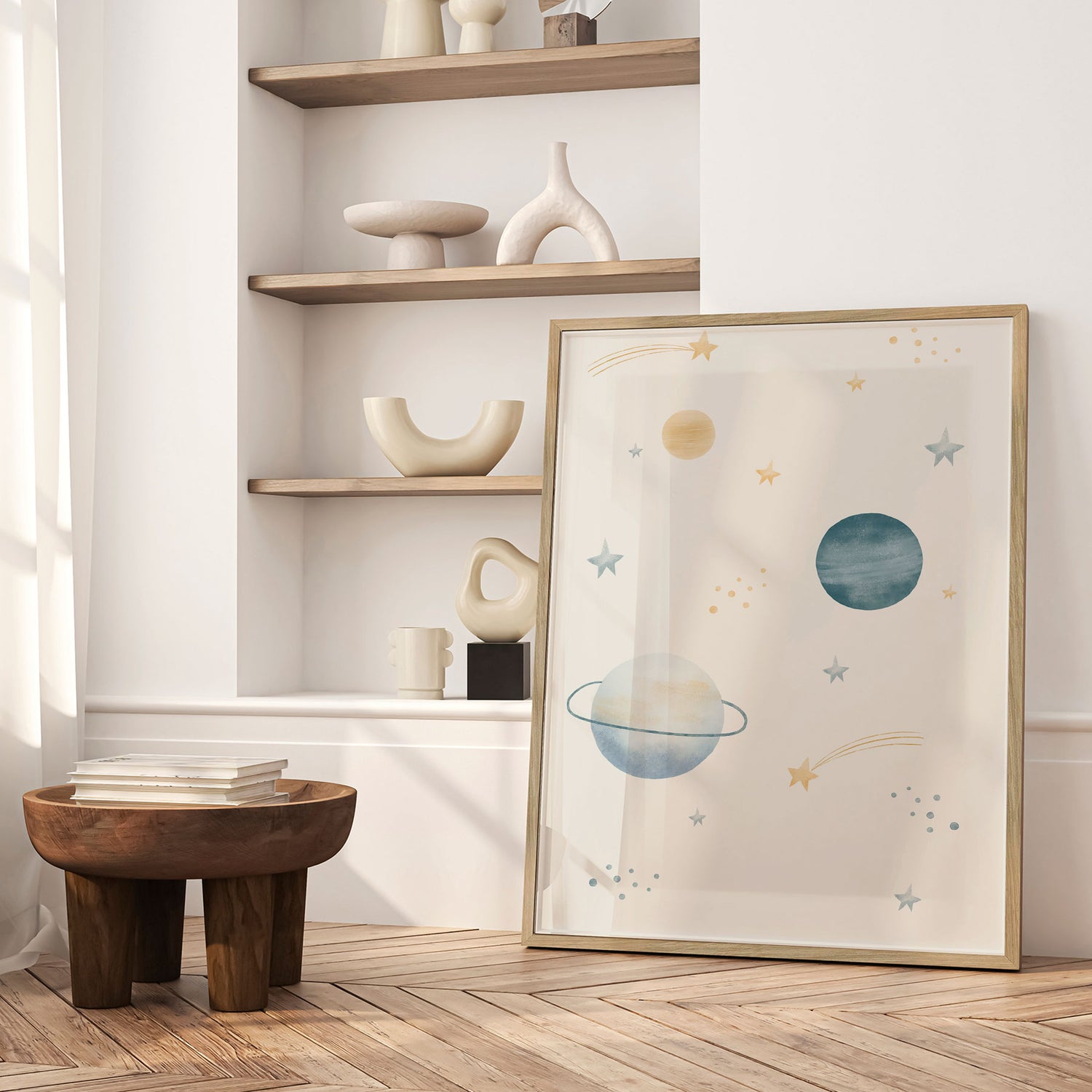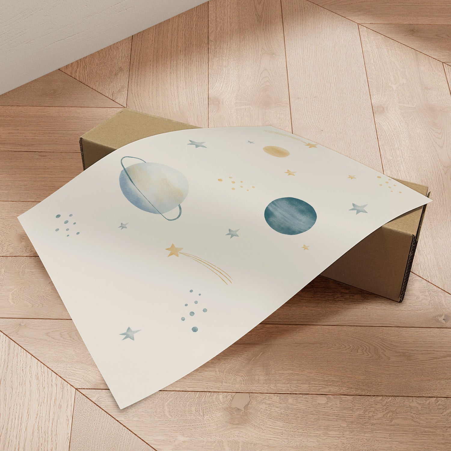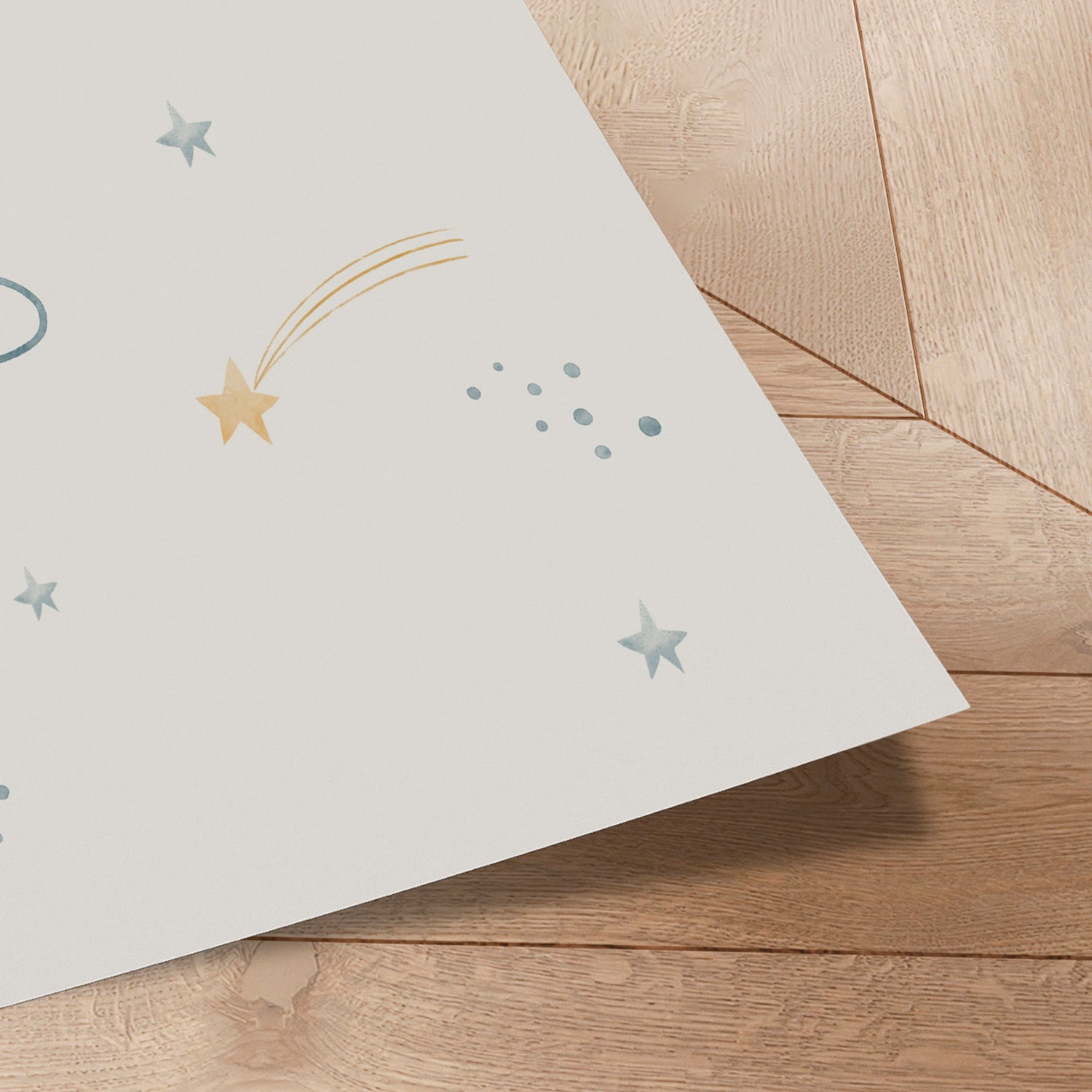 "Cosmic Dream" af Menina Lisboa åbner døren til et stille og fantasifuldt univers, hvor planeter, stjerner og gyldne stjerneskud svæver let over den lyse baggrund. De bløde blå og gyldne nuancer skaber en poetisk balance mellem eventyr og ro, mens de enkle former giver motivet et moderne og drømmende udtryk. Kompositionen inviterer til nysgerrighed og forestillinger om fjerne galakser og nattens magi. Et elegant værk, der tilfører børneværelset en følelse af undren, lethed og kosmisk charme.✓ Produceret i Danmark