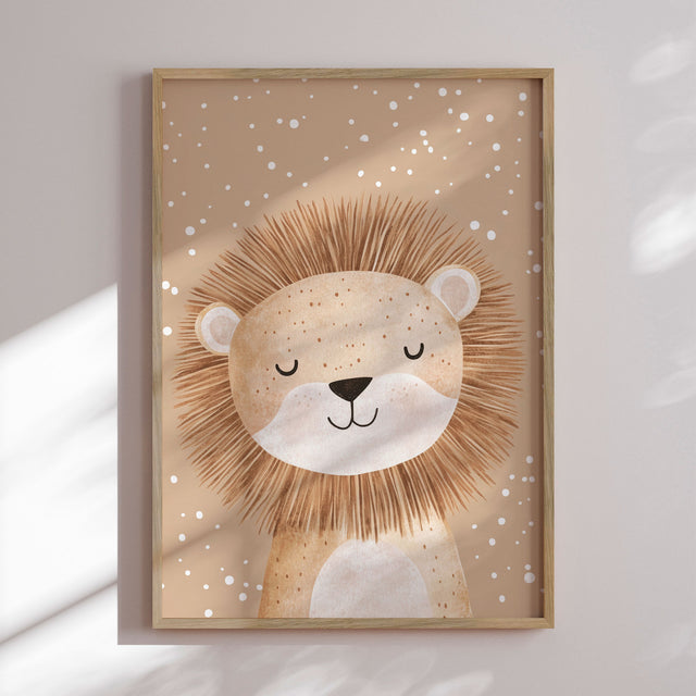"Dreamy Lion" af Treechild udstråler ro og venlighed med sin fredfyldte løve, der hviler med lukkede øjne i en drømmende verden af varme sandfarver. De bløde beige og gyldne nuancer skaber en varm og harmonisk atmosfære, mens løvens fine manke med sine mange delikate streger giver motivet tekstur og liv. De små hvide prikker omkring figuren tilfører en let magisk stemning, som gør værket både beroligende og fantasifuldt. Et blidt og charmerende kunstværk, der bringer tryghed, varme og stille eventyr ind i børneværelset.✓ Produceret i Danmark