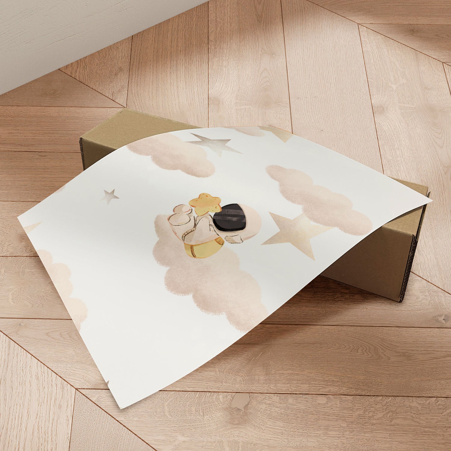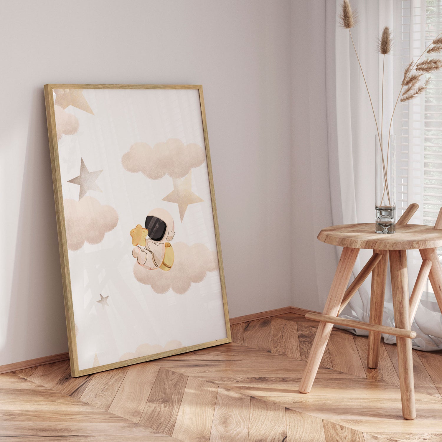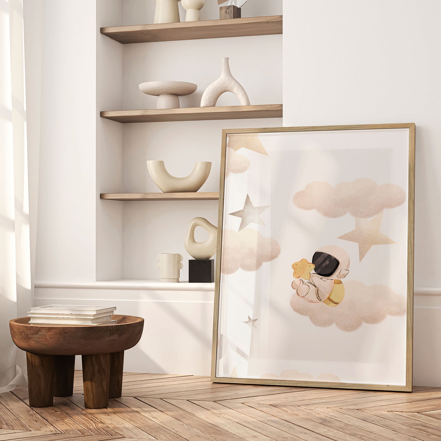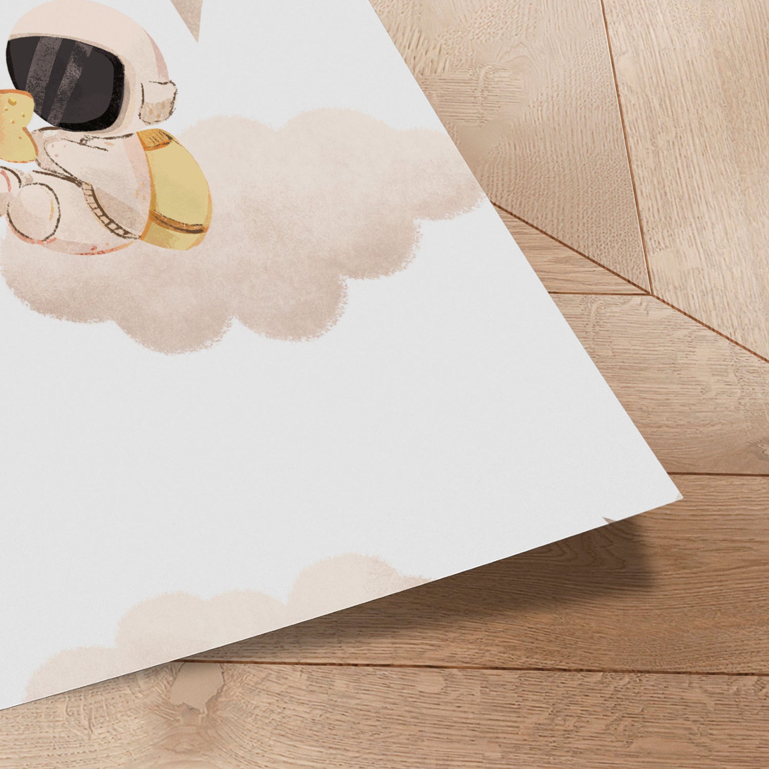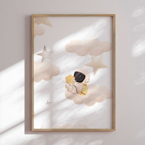 "Little Astronaut’s Star Dream" af Saskia Michele inviterer ind i et blidt og eventyrligt univers, hvor en lille astronaut svæver mellem skyer og stjerner med en gylden stjerne i favnen. De sarte beige og varme gyldne toner skaber en rolig og drømmende atmosfære, mens de bløde former giver motivet et poetisk og trygt udtryk. Illustrationen emmer af fantasi og nysgerrighed og vækker drømme om stjernehimlen og uendelige galakser. Et charmerende værk, der bringer varme, eventyr og kosmisk magi ind i børneværelset.✓ Produceret i Danmark