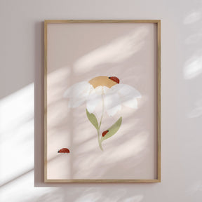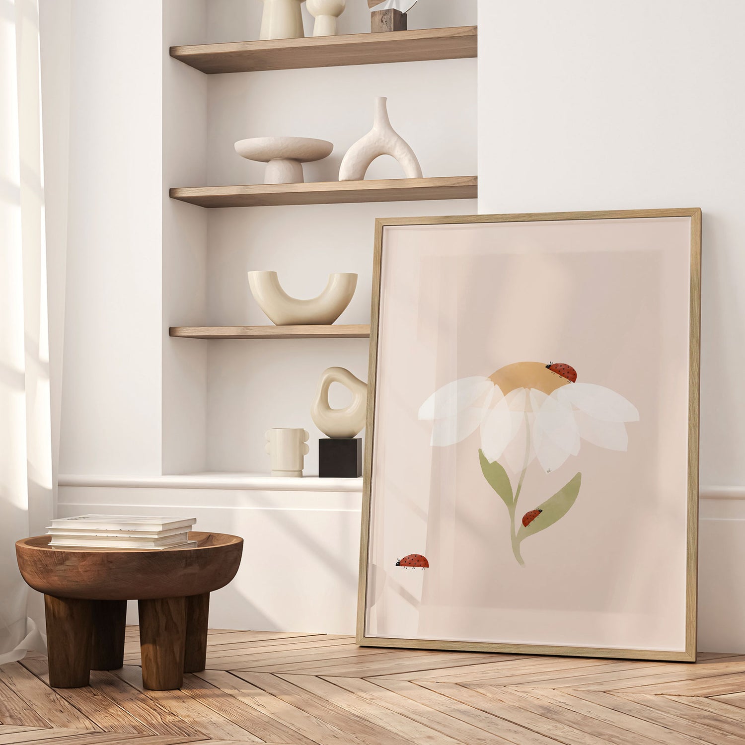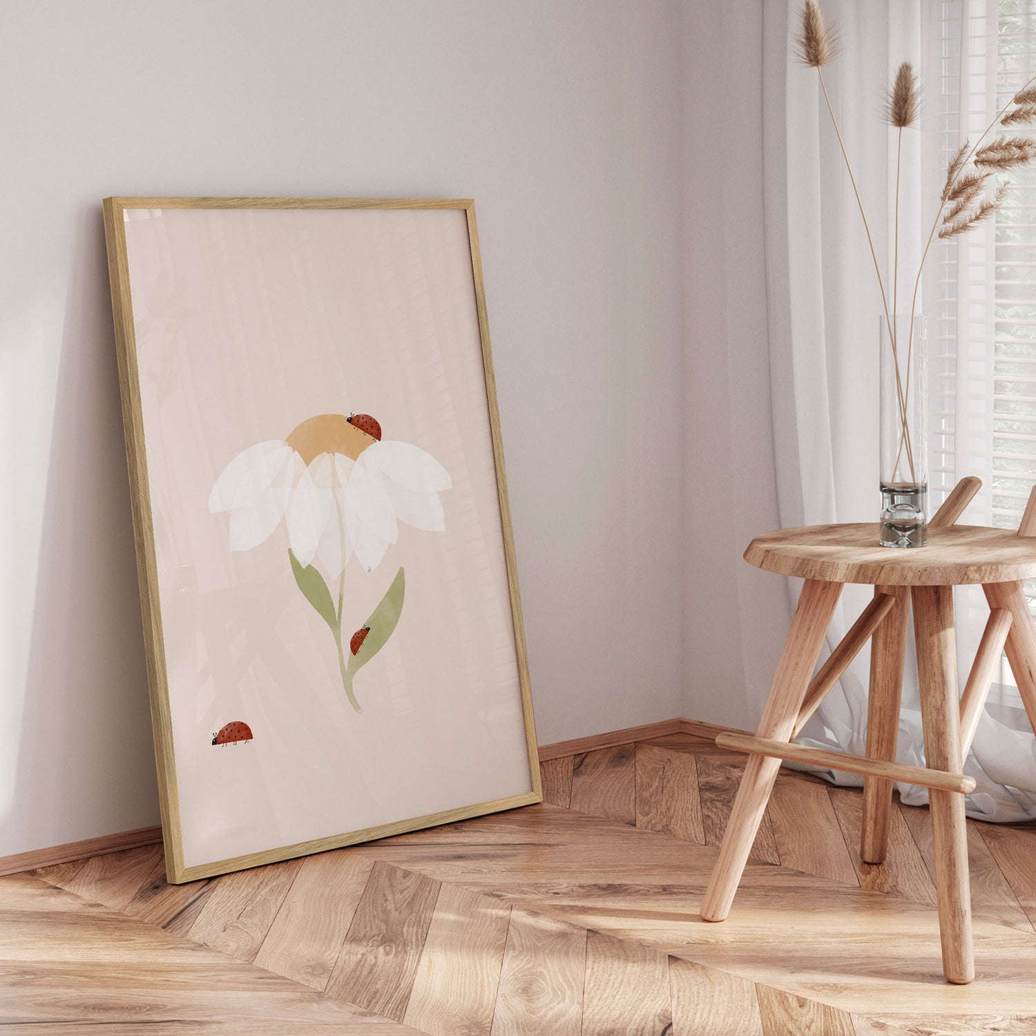 "Sweet Daisy Ladybugs" af Menina Lisboa udstråler lethed og naturlig charme med sin fine hvide marguerit omgivet af små røde mariehøns. De sarte pasteltoner i beige, creme og blød grøn skaber en rolig og harmonisk baggrund, mens de røde detaljer tilfører liv og legende energi til motivet. Den enkle komposition og de bløde former giver værket et poetisk og nordisk udtryk, der føles både let og indbydende. Et yndigt kunstværk, der bringer naturens stille skønhed og sommerlig glæde ind i børneværelset.✓ Produceret i Danmark