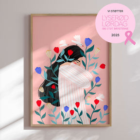 "Blossoms and Serenity" af Bea Müller indfanger et øjeblik af stille nærvær. Den portrætterede kvinde omfavnes af farverige blomster i røde, blå og gule nuancer, mens hvide duer svæver fredeligt omkring hende. Motivet balancerer mellem styrke og blidhed og formidler en følelse af ro, håb og harmoni. En plakat, der bringer varme og poesi ind i hjemmet og minder os om at finde fred i de små øjeblikke.✓ Produceret i Danmark