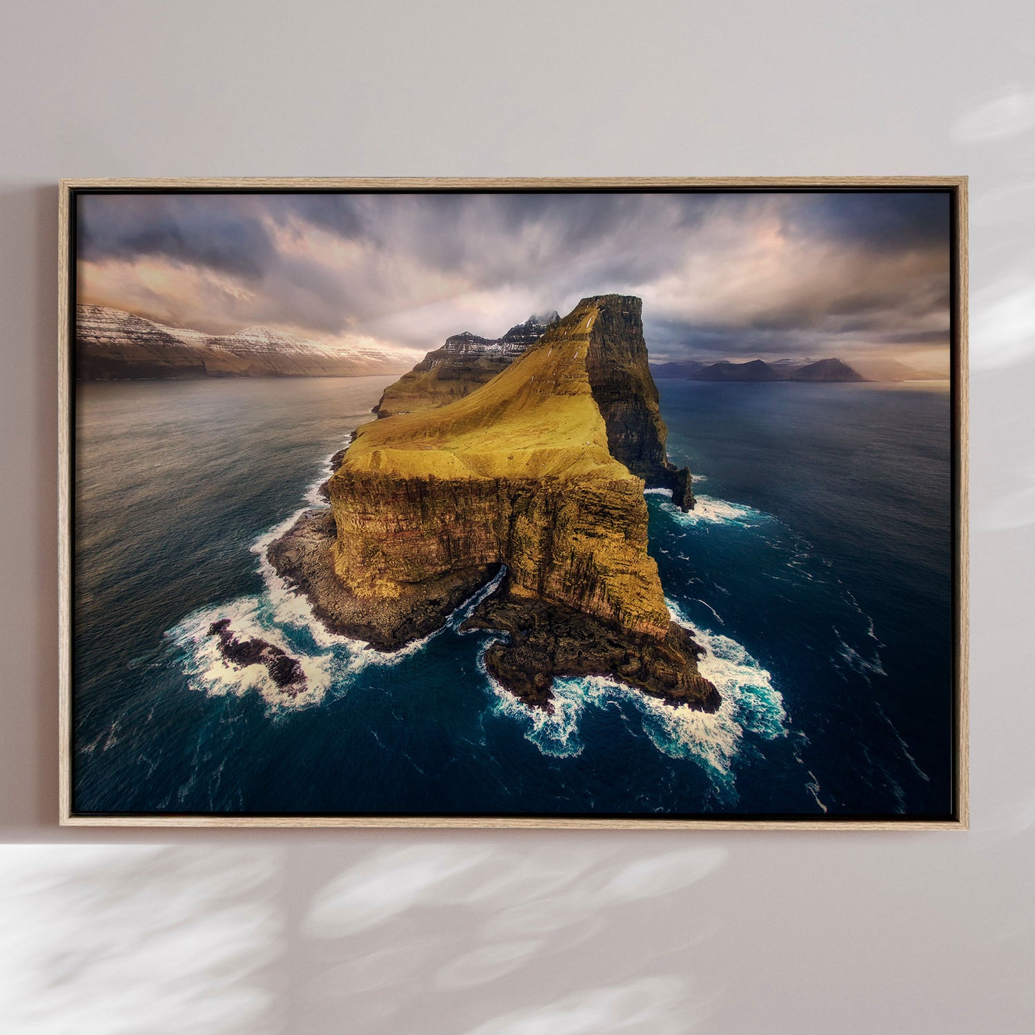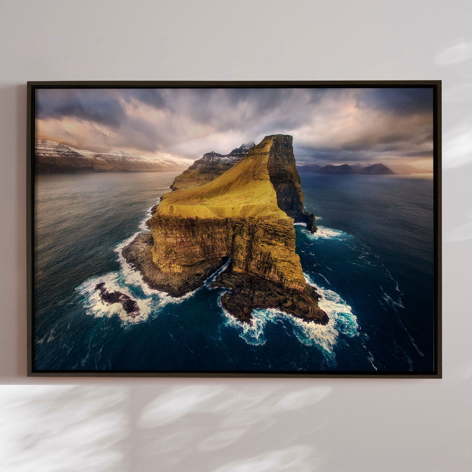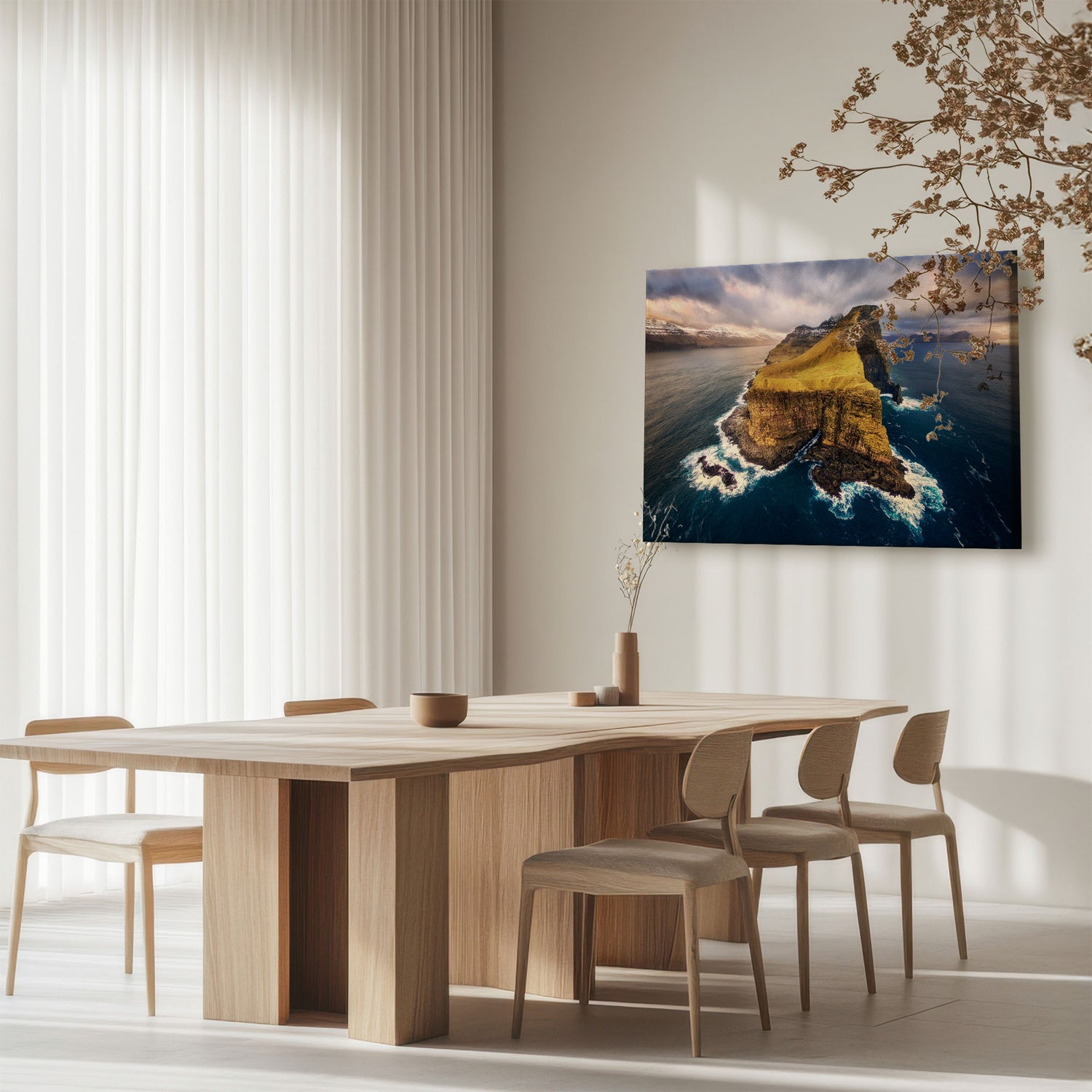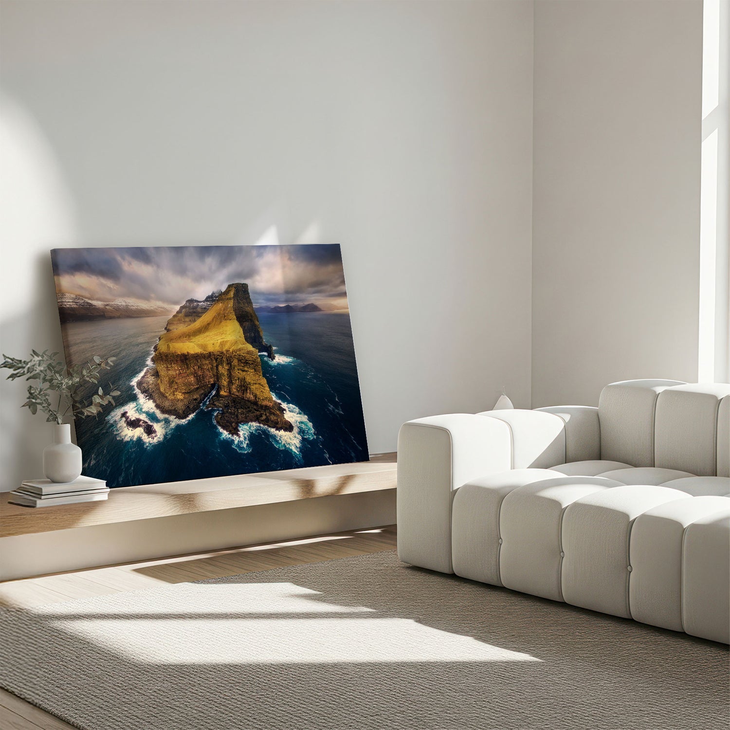 "Kalsoy" af Mads Iversen indfanger Færøernes dramatiske landskab, hvor stejle grønne klipper møder havets uendelige horisont. Tåge og blødt lys svæver over terrænet og skaber en rolig, næsten mystisk stemning. Kompositionen balancerer rå natur og nordisk poesi. Et lærredstryk, der bringer frisk luft, frihed og tidløs skønhed ind i hjemmet.Billedet blev taget af den prisvindende fotograf Mads Iversen.