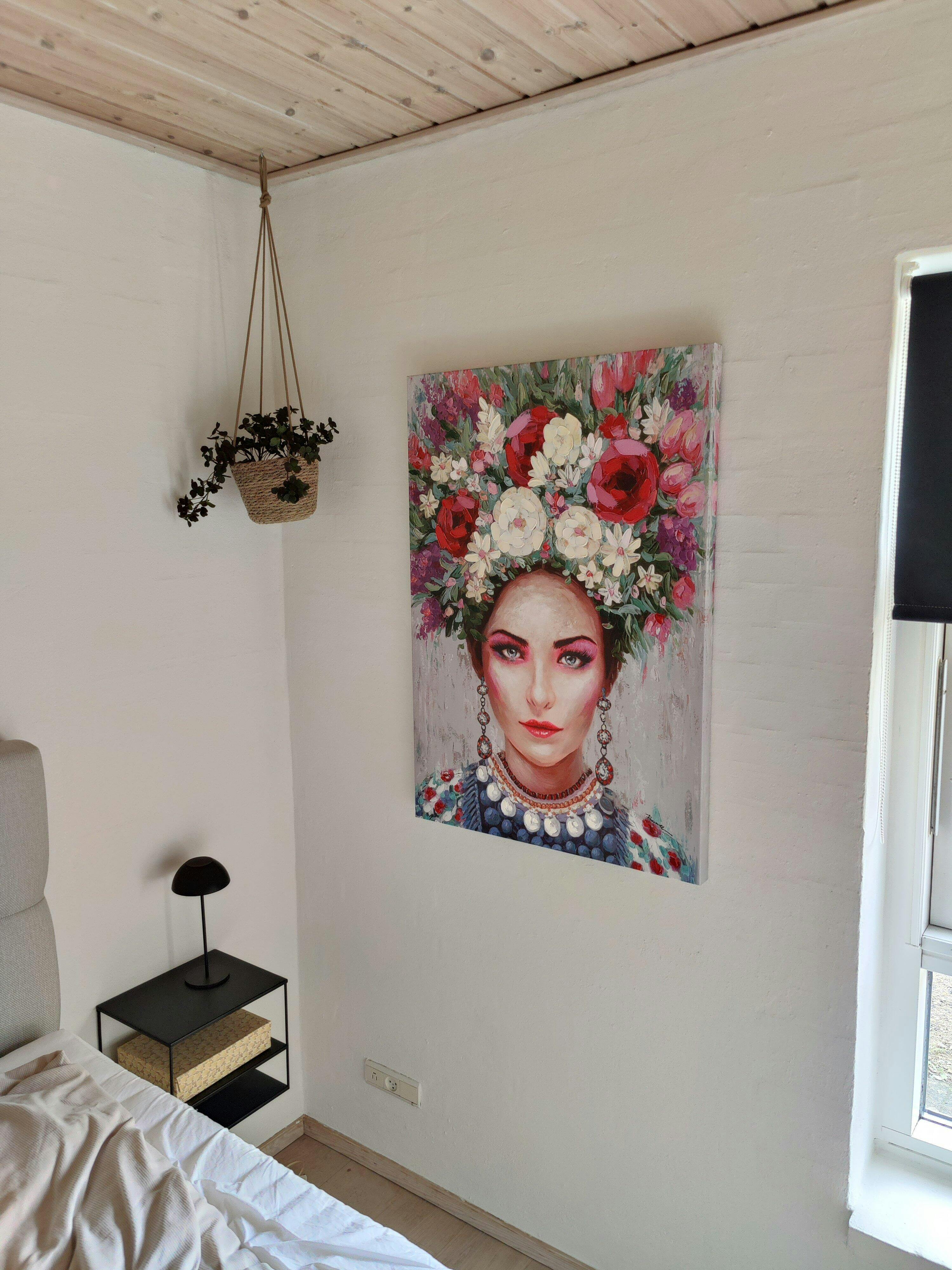 "Tranquilo" er et fængslende maleri, der udstråler ro og skønhed. Maleriet viser en kvinde med en pragtfuld blomsterkrans, der indrammer hendes ansigt. Farvepaletten består af levende røde, gule, lilla og grønne nuancer, som skaber en kontrast til kvindens lyse hudtone og dybe, udtryksfulde øjne. De fine detaljer i smykkerne og hendes tøj giver værket en ekstra dimension af elegance og raffinement. Dette mixed media maleri vil uden tvivl tilføje et strejf af farve og charme til enhver væg, det pryder.✓ Mixed Media: Kombinerer lærredstryk og håndmalede detaljer