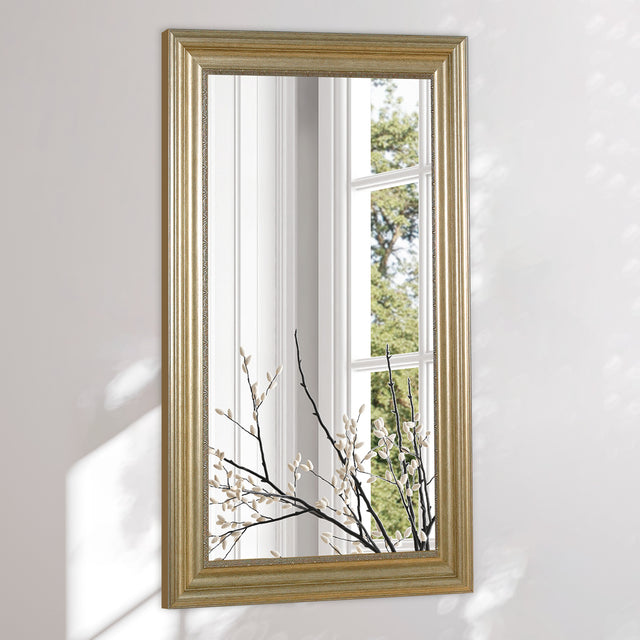 Elegant med smukt antik spejl med en flot ramme med et champagnefarvede finish. Spejlet passer rigtig godt til det stilrene og moderne hjem, men kan også kombineres med loppefund og vintage indretning. Rammen har en bredde på 8 cm.✓ Designet i Danmark