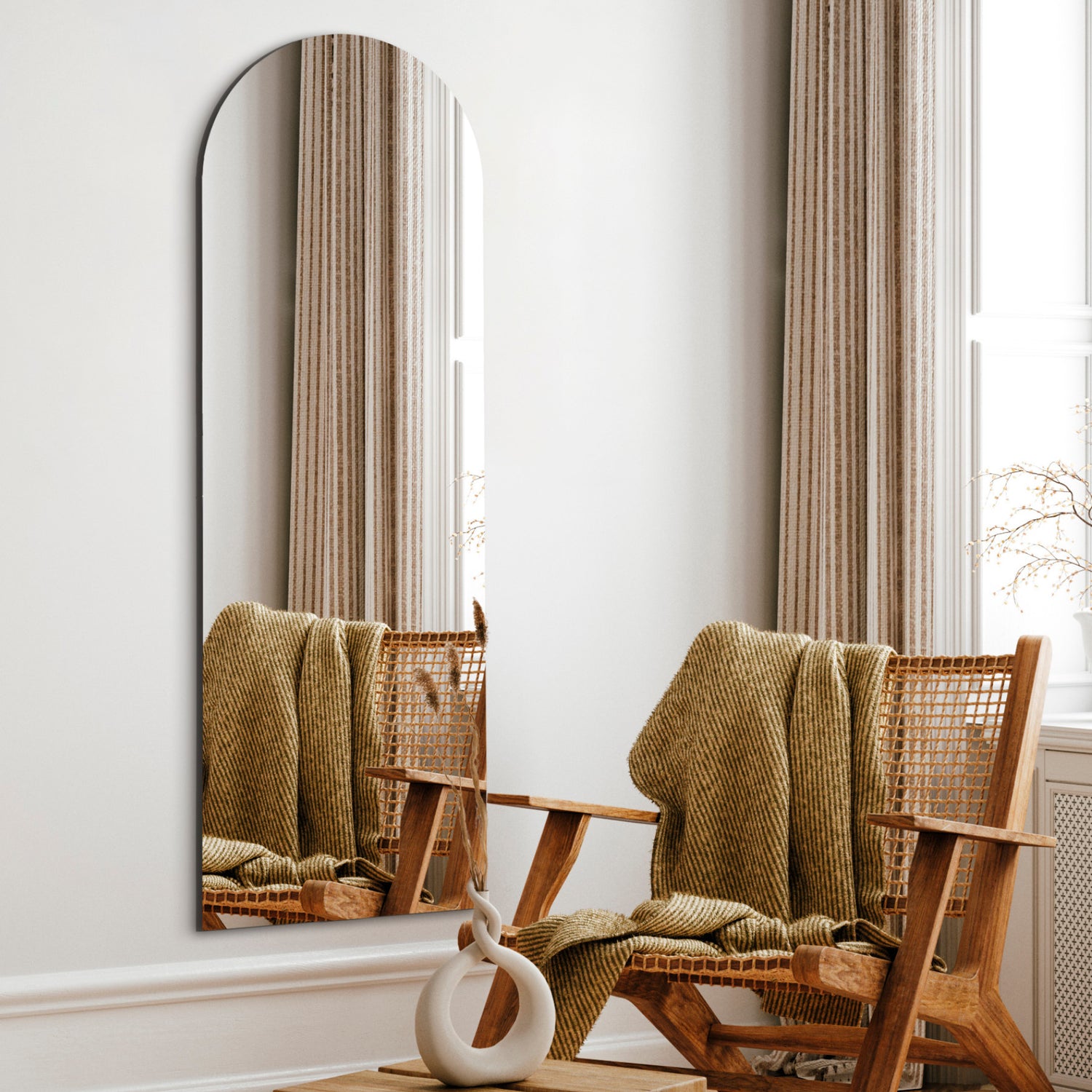 Dette organisk formede spejl, der kombinerer bløde og hårde kanter og er formet som en bue, udstråler en følelse af elegance og raffinement. Med sit eksklusive og luksuriøse design tilføjer det ikke kun æstetisk appel, men også funktionalitet til ethvert rum. Dette spejl er en smuk kombination af form og funktion og vil være et iøjnefaldende element i ethvert rum. Dets unikke form og eksklusive design vil skabe en atmosfære af raffinement og stil.✓ Dansk design