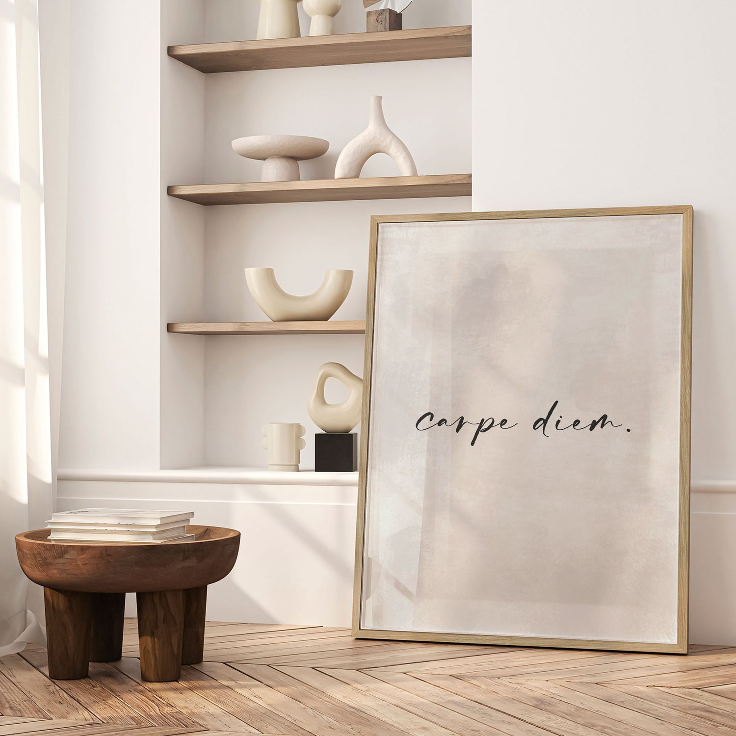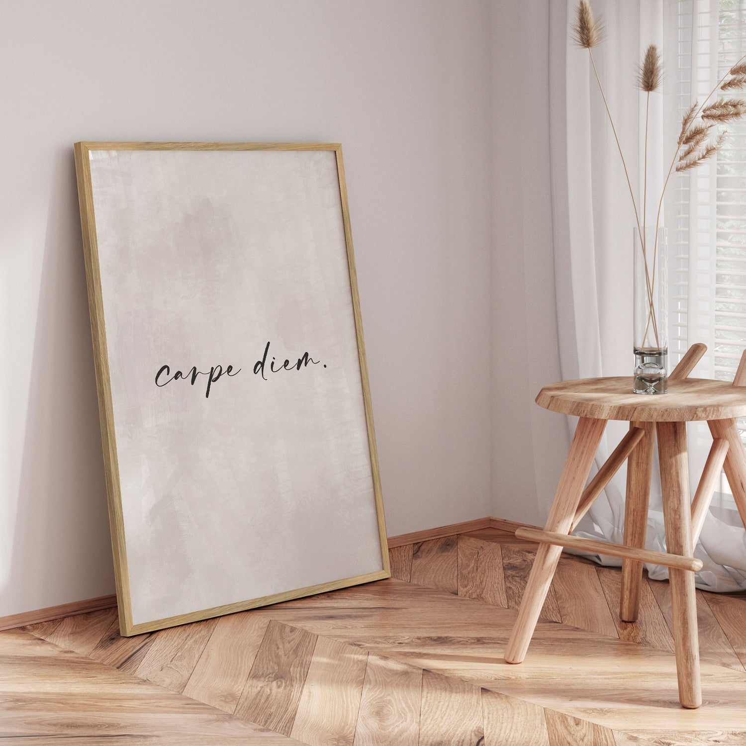 "Seize the Moment" af Treechild er et roligt og eftertænksomt kunsttryk, hvor en enkel typografisk gestus får lov at stå alene i en lys, afdæmpet komposition. De bløde gråtoner i baggrunden skaber et let, næsten poetisk rum, mens ordene fremstår som en stille påmindelse om nærvær og nuets værdi. Det minimalistiske udtryk med ordene "carpe diem" giver plads til refleksion og ro og gør værket let at integrere i enhver indretning. En elegant og tidløs plakat, der tilfører rummet en subtil følelse af balance og bevidsthed.