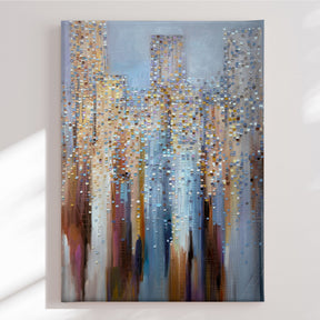“City in the Clouds” af Ekaterina Ermilkina er et moderne bylandskab, der svæver mellem virkelighed og fantasi. De lodrette penselstrøg og de små farvede elementer skaber en følelse af bevægelse og puls, som om byen vibrerer af liv. De bløde blå og varme jordfarver smelter sammen i et drømmende udtryk, hvor højhuse forvandler sig til lysspor og refleksioner. Et kunstværk, der bringer storbyens energi ind i hjemmet.✓ Designet og produceret i Danmark