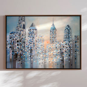“Sunrise in Philadelphia” af Ekaterina Ermilkina indfanger det magiske øjeblik, hvor storbyen vågner. De ikoniske skyline-tårne står badet i bløde pasteller, mens små cirkulære farvepletter funkler som lysglimt fra vinduer og gader langt under skyerne. Motivet skaber en harmonisk balance mellem byens energi og den rolige morgenstund. Et moderne, stemningsfuldt kunstværk, der bringer lys, håb og storbyens puls ind i din indretning.✓ Designet og produceret i Danmark